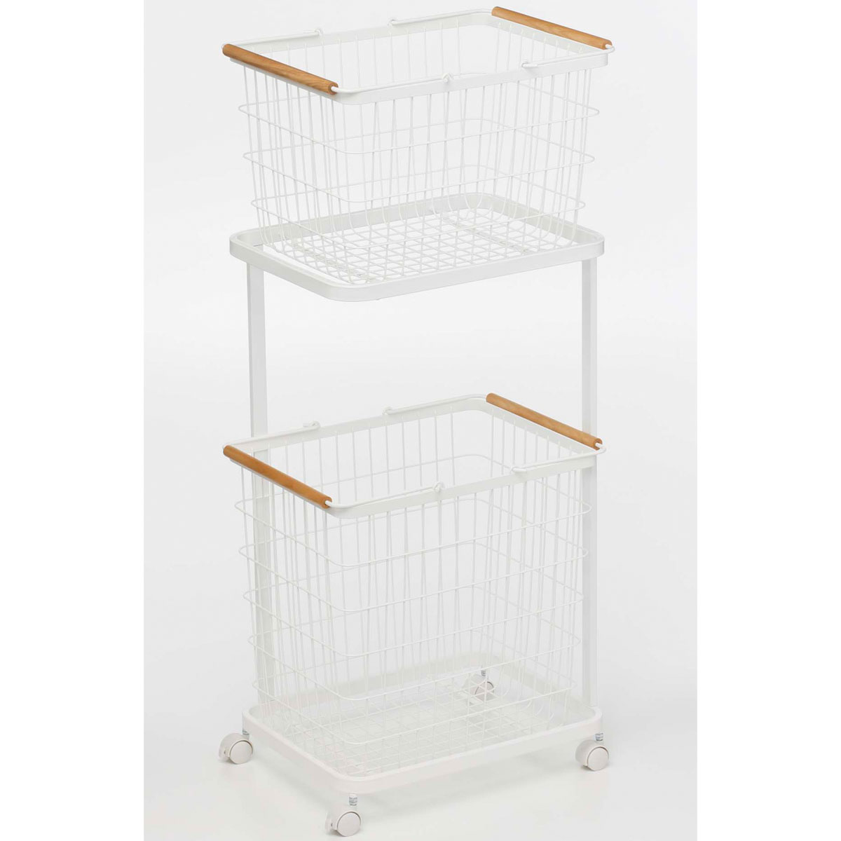 3点セットでお届けします ホワイトスチールと木の組み合わせが美しいランドリーワゴン&バスケット。ランドリーワイヤーバスケットが2台置ける「ランドリーワゴン」と、「ランドリーワイヤーバスケットM」「ランドリーワイヤーバスケットL」の3点セットでお届けします。 縦置き、横置き両対応 コーナーが開いたデザインになっているので、縦置きでも横置きでもランドリーバスケットが取り出しやすい構造です。ランドリーバスケットのハンドルは持ち運びやすいように水平に収納されるデザインになっています。 商品の情報 ・ブランド:YAMAZAKI(山崎実業)/日本 ・ジャンル:ランドリーバスケット ・主な素材:スチール 粉体塗装(本体)/ナイロン(キャスター)/スチール ユニクロメッキ 粉体塗装、天然木(バスケット) ・サイズ:約W400xD290xH940mm ・耐荷重:約6kg(1段に付き)/約3kg(ランドリーバスケット M)/約4kg(ランドリーバスケット L) ・容量:約23L(ランドリーバスケット M)/約33L(ランドリーバスケット L) ・内容物:ランドリーワゴン/ランドリーバスケット Mサイズ/ランドリーバスケット Lサイズ/六角レンチ/スパナ ・その他:商品はお客様組立て品となります。
