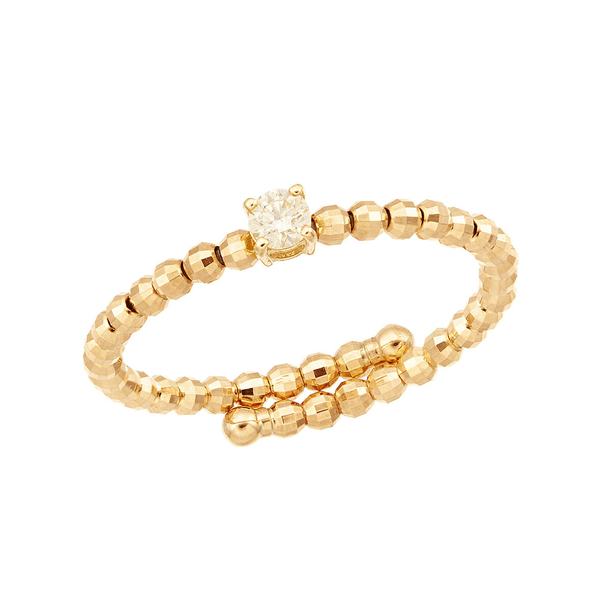 華奢なカットボールを連ねたアームに一粒のダイヤモンドがキラリと光るリング。カットボールとダイヤモンドの異なる煌めきが、手元を華やかに彩ります。フリーサイズなので、気分に合わせて着ける指を変えれば、色々な手元のコーディネートが楽しめます。地金素材:K18YG/形状記憶チタンワイヤー(内部)使用宝石:ダイヤモンド幅:約2〜3mmこちらのリングはフリーサイズとなります。中に形状記憶ワイヤーを使用しております。サイズ直しは出来かねます。予めご了承くださいませ。※サイズガイドはこちら※有料ケースはこちら