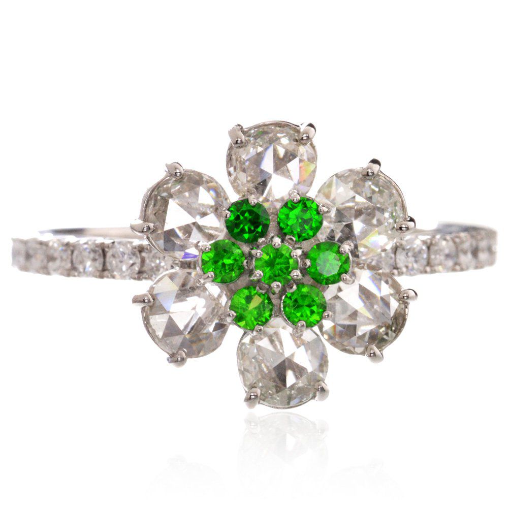商品番号 DXD00155 使用貴金属 Pt950(プラチナ950) 使用石 ダイヤモンド計1.00カラットデマントイドガーネット計0.25カラット 総重量 約4.1g ※12号で計量しています サイズ 幅:(リング上部)約11.7mm(リング下部)約1.6mm厚み:(リング上部)約5.0mm(リング下部)約1.1mm 付属品 鑑別書 ジュエリーケース 備考 納期4週間(受注生産品・商品代引不可)※本商品はご注文確定後からの石取寄せとなります。稀少石を使用しておりますため、石探しに日を要しました場合、ご案内の納期目安より完成が遅れる場合がございます。 一般的なブリリアントカット(58面体)よりもカット面が少ないローズカットは内側から溢れ出すような潤いのある輝きが特徴的。傷、内包物の少ない上質なローズカットダイヤと、稀少石として人気のデマントイドガーネットでフラワー状のリングに仕上げました。大ぶりのフラワーを引き立てる細身のアームで上品かつドラマチックな人気モチーフです。(同型のパライバトルマリン版、アウイナイト版、ネックレスもございます)素材は高純度プラチナ950を使用しています。 Pt950 パライバトルマリン ダイヤモンド リング 指輪 ローズカット価格:240000円(税別) Pt950 アウイナイト ローズカットダイヤモンド リング価格:220000円(税別) その他アウイナイトジュエリー一覧はこちら 完全1点もの VIPセレクション デマントイドガーネットジュエリー一覧人気メンズジュエリー 人気レディースジュエリー 新作ジュエリー 喜平一覧