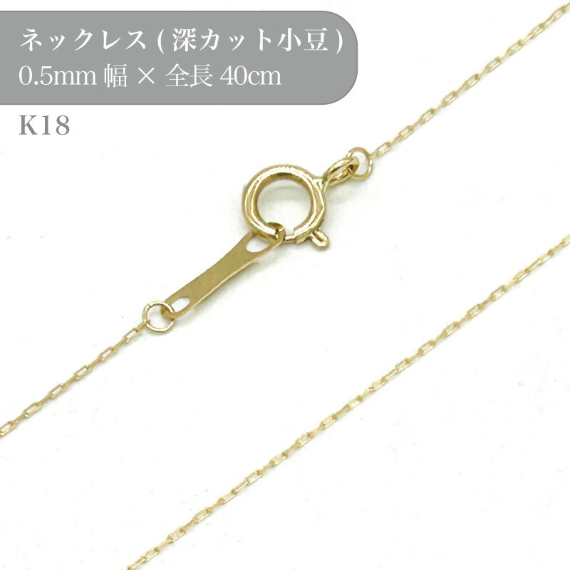 18金(k18)の小豆深カットチェーンネックレスです。 ネックレスチェーンの定番の形です。 コマを90度にひねり、交互につなぎ合わさっている作りになっています。 シンプルなデザインなので、チェーンの存在感を抑えたい場合や、カジュアルにも使用できます。 留め具部分はスライド式の為、長さが調節できます。 【サイズ】 全長:40cm 幅:約0.5mm 線径:約0.01mm 【目安重量】 0.38g 【18金(k18)とは】 地金の75%(24分の18)以上が金で構成されています。 金ならではの上質な風合いが楽しめます。 また、金属アレルギーが出にくい点も魅力の一つです。 ダルマカンに刻印があります。