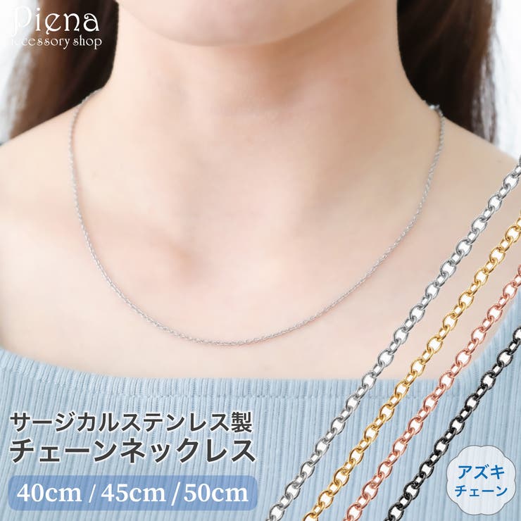 素材サージカルステンレス製サイズチェーン長さ:約40cm、約45cm、約50cmチェーン太さ:約1.5mm 繊細でさりげない存在感を与えるアズキチェーンのネックレス。華奢なデザインは単品でも重ねても使いやすく、胸元を美しく飾り上品で大人な印象を与えてくれます。あえてチャームのないシンプルなデザインが上質で自由なスタイルにふさわしいデザインです。お持ちのネックレスチャームとも合わせてオリジナルのアクセサリー作りとしてもお楽しみ頂けます。きれいめファッション、ストリート系ファッション、カジュアル、オフィスシーン、様々なスタイルにマッチする圧倒的人気を誇るシンプルなチェーンネックレスです。記念日、自分へのご褒美、プレゼント、クリスマス、誕生日など、様々なイベントの贈り物にぴったりの洗練されたアクセサリーです。 素材は医療用工具のメスやハサミにも使用されているサージカルステンレスを使用していますので、金属アレルギーの方でも比較的安心してご使用頂けます。(全ての方に金属アレルギーが出ない事を保障する物ではございません)返品・交換について購入後の交換は受け付けておりません。予めご了承ください。返品を希望される場合は購入履歴一覧の「ショップへの問い合わせ」よりお問い合わせください。=========================複数配送先指定について1件の注文に対して、異なる住所への配送は対応出来かねます。恐れ入りますが、異なる住所へ配送をご希望の場合、配送先毎に分けて注文いただきますようお願い申し上げます。【アクセサリーWOMEN】シルバー ゴールド ピンクゴールド ブラック 40cm 45cm 50cm