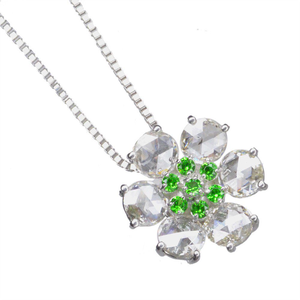 商品番号 DXD00153 使用貴金属 トップ Pt950(プラチナ950)チェーンPt850(プラチナ850) 使用石 デマントイドガーネット計0.09カラット ダイヤモンド計0.79カラット 総重量 約3g サイズ トップ:横約11.8mm×縦約11.8mm×厚み約5.3mmチェーン長さ:45cm(45cm内で調整自在)チェーンの太さ:約0.7mm トップ取り外し可能 付属品 鑑別書 ケース 備考 納期4週間(受注生産品・商品代引不可)※本商品はご注文確定後からの石取寄せとなります。稀少石を使用しておりますため、石探しに日を要しました場合、ご案内の納期目安より完成が遅れる場合がございます。 一般的なブリリアントカット(58面体)よりもカット面が少ないローズカットは内側から溢れ出すような潤いのある輝きが特徴的。傷、内包物の少ない上質なローズカットダイヤと、稀少石として人気のデマントイドガーネットでフラワー状のネックレスに仕上げました。大ぶりのフラワーが上品かつドラマチックな人気モチーフです。(同型のパライバトルマリン版、アウイナイト版、リングもございます) Pt950 パライバトルマリン ダイヤモンド ネックレス ローズカット価格:218000円(税別) Pt950 アウイナイト ローズカットダイヤモンド ネックレス価格:200000円(税別) その他アウイナイトジュエリー一覧はこちら 完全1点もの VIPセレクションプラチナ レディース ペンダント 人気メンズジュエリー 人気レディースジュエリー 新作ジュエリー 喜平一覧