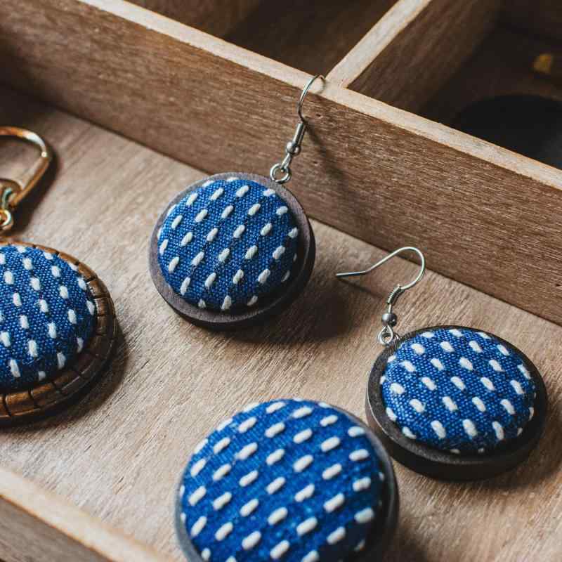 ピアス レディース 手作り ウッド 刺し子染め 布製 イヤリング 和風 揺れる 大ぶり アレルギー対応 おしゃれ かわいい ナチュラル 民族風 普段使い 旅行