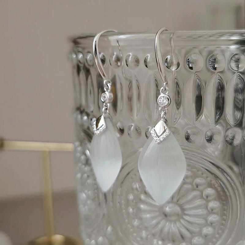 ピアス レディース S925 シルバー イヤリング 小顔効果 通体銀 菱形 白色 猫目石 和服 アクセサリー