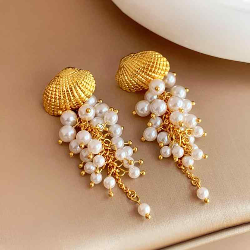 ピアス レディース 法式 宮廷風 復古風 イヤリング チタン製 揺れる タッセル 貝殻 パール デザイン 冷淡風 長い 金属アレルギー対応