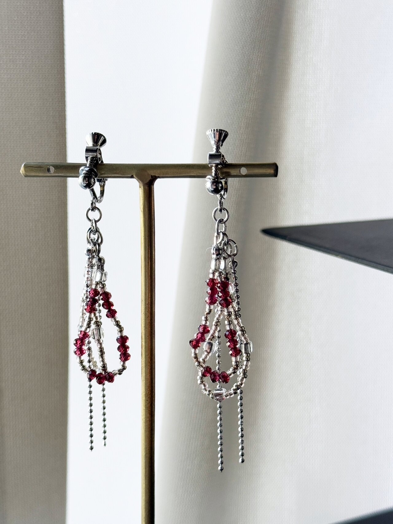 商品情報金具の交換<金具無料交換 〜金属アレルギーの方も安心して身につけられます〜>お好みの金具(形状)をお選び頂けます。===1. イヤリング(ネジバネ式/メッキ加工(本ロジウム))2. イヤリング(ノンホールピアス式/樹脂製)3. ピアス(フック式/メッキ加工(本ロジウム))4. ピアス(スタッド式/メッキ加工(本ロジウム))5. ピアス(フック式/チタン製)6. ピアス(フック式/樹脂製)===※本ロジウムとは、ホワイトゴールドとロジウムを配合した特殊コーティングのこと。通常のメッキと比べ艶や輝きがあり、それが長続きしてくれます(使い方により劣化具合が変わります)。サイズ約6m(イヤリング/ピアス金具部分を除く)素材・糸:シルク糸(しなやかで滑らかな動き)・天然石:モザンビーク産ガーネット金具の色シルバー(ロジウムカラー)【1月の誕生石 ガーネット】実りの赤を、そっと身につける 揺れる イヤリング ピアス モザンビーク産ガーネット 金属アレルギー対応 大人の天然石アクセサリー 深みのある赤が、呼吸するように、やさしく揺れる。努力を重ねてきた大人の女性に寄り添う、1月の誕生石・ガーネットのイヤリング/ピアスです。 「変わらない想い」「実り」「誠実さ」を象徴する石。 深みのある赤が、動くたびにやさしく揺れる。モザンビーク産ガーネットと極小ビーズを使い、しなやかな動きが印象的なイヤリング/ピアスを制作しました。使用しているガーネットは、約3×3×2mmほどの小粒サイズのボタンカット。小さいながらも発色が良く、透明感のある上質な天然石です。丁寧な研磨とシャープなエッジにより、わずかな光を受けるだけで内側から輝きが生まれます。石と極小ビーズは、シルク糸で一粒ずつ丁寧につなぎました。金属では表現できない、糸ならではの柔らかさが、耳もとで「揺れる」というより“呼吸するように動く”しなやかな表情を生み出します。縦に流れるようなラインと、雫が連なったような立体的なフォルムは、顔まわりをすっきりと見せ、控えめながら確かな存在感を添えてくれます。 糸仕立てのためとても軽く、長時間でも快適。 シンプルな装いから、少し改まった場面まで対応。 華やかすぎず、大人の落ち着きを演出。 少しだけ自信がほしいとき。 節目や新しいスタートを迎えるとき。 気分をぐっと上げたい休日に。 数あるショップの中から、当店をご覧いただきありがとうございます。canohaアクセサリーは、幅広い世代の方に身につけて楽しんでいただけるアクセサリーたちですが、中でも「年齢を重ねた今だからこそ、身につけたい輝き」がメインです。人生を重ねてきたからこそ、自分の軸ができ、同時に少し立ち止まりたくなる瞬間も増えていく。華美すぎるものではなく、けれど確かな存在感をもつもの。日常にそっと寄り添いながら、気持ちを整え、背中を押してくれるアクセサリーを届けたい――その想いを胸に、ひとつひとつ丁寧に制作しています。作品の多くは一点もの、またはごく少数でのご用意です。石の表情や輝きはそれぞれ異なり、同じものは二つとありません。その個性を活かしながら、身につける方の毎日に自然となじむデザインへと仕立てています。またレジン(樹脂)アクセサリーも人気です。仕入れから制作、仕上げまでを一貫して行うことで、できるだけお求めやすい価格でお届けできるよう心がけています。「いいものを、長く、無理なく身につけて楽しんでほしい」「毎日ちょっとしたハッピーを感じてほしい」それが、canohaの変わらない想いです。また当店のアクセサリーは、年齢や性別を限定しないアクセサリーを多く制作しております。ご自身へのご褒美としてはもちろん、大切な女性へ贈るギフトとして選んでくださる男性のお客様も多くいらっしゃいます。「いつもありがとう」「これからもあなたらしく輝いてほしい」言葉では照れくさい気持ちも、アクセサリーに託すことで、自然に伝わることがあります。ご希望がございましたら、すべての商品は無料ラッピングにて心を込めてお包みいたします。この小さな輝きが、誰かの一日を少しやさしくし、身につけるたびに、自分を大切にする気持ちを思い出すきっかけとなりますように。そんな願いを込めて、今日も制作に向き合っています。 1-2営業日以内に発送してまいります。1