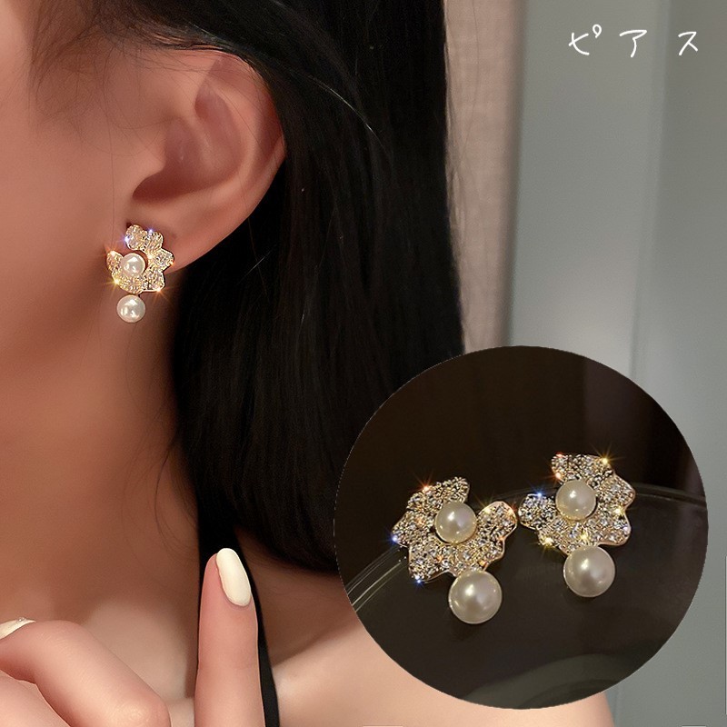 ゴールドカラーの土台にちりばめられたラインストーンが華やかなピアス。 動くとフェイクパールが揺れるデザインで、 ドレスなどの盛装に合わせるにもぴったりのアクセサリーです♪ 【サイズについて】 画像をご参照ください。 【カラーについて】 生産ロットにより柄の出方や色の濃淡が異なる場合がございます。 お使いのモニターや撮影時の光の加減などにより 画像と実際の商品のカラーが異なる場合もございます。 予告なしにカラーやデザインなどの変更がある場合もございます。 【素材について】 合金