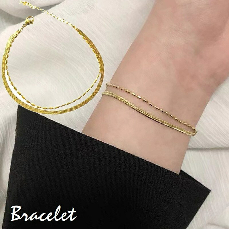 2連のデザインや華奢なフォルムが可愛いブレスレット。 シンプルでいて女性らしさを際立てるアイテムです。 自分用はもちろん、プレゼント用としてもおすすめ♪ 【サイズについて】 *訂正 チェーン長さ15.5CM 【素材について】 合金