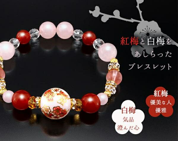 ■商品紹介商品番号:ns-im-k13727★紅梅と白梅をあしらった梅花ブレスレット! 優しい色合いのブレスレット。◇紅梅:「優美な人・優雅」 白梅:「気品・澄んだ心」を表すと言われています。*招福パワーのブレスレット。◇白水晶:願望成就◇黄水晶:金運・財運 ◇ローズクォーツ:恋愛◇赤メノウ:健康長寿 ◇チェリークォーツ:癒し ■サイズ・容量・規格サイズ内周:約 17 cm 重量約 19 g個装状態PP袋生産国日本<材質>アクリルビーズ:16mm珠×1個(梅花プリント加工)白水晶:6mm珠×4個、6x3mm(カット)×4個黄水晶:6x3mm(カット)×2個赤メノウ:10mm珠×2個、8mm珠×2個ローズクォーツ:10mm珠×4個、6mm珠×2個チェリークォーツ:8mm珠×2個ロンデル:6x3mm×6個(真鍮・ラインストーン)ビーズクォーツ:4mm×4個(真鍮)<付属品>専用巾着袋■注意事項■こちらの商品はメーカー直送品となります。■メーカーに在庫が無い場合はキャンセルさせていただくことがございます。■お客様ご都合による返品・交換は出来ませんのでご注意ください■北海道、沖縄、離島については別途送料が掛かります。