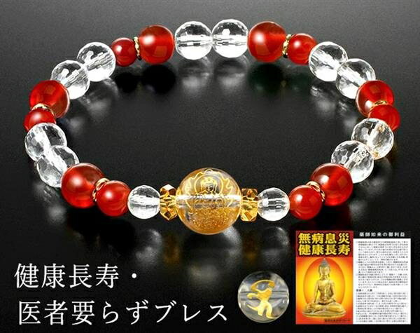 ■商品紹介商品番号:ns-im-k14147★お薬師さまに健康を祈る!*白水晶に薬師如来と梵字を刻印しました。*赤メノウ部分は瓢箪型になって6個(無瓢箪)繋がっています。*健康と長寿を願うブレスレット。◇白水晶・・・・・全体運・願望成就◇赤メノウ・・・・健康長寿・自己実現◇黄水晶・・・・・金運財運 ■サイズ・容量・規格サイズ内周:約 18 cm重量約 17 g 個装状態PP袋生産国日本<材質>白水晶:12mm珠×1個(薬師如来刻印)、8mm珠(カット)×10個、6mm珠(カット)×2個赤メノウ:8mm珠×6個、6mm珠×6個黄水晶:6x3mm(カット)×2個ビーズパーツ×6個(真鍮)<付属品>専用巾着袋、薬師如来お守りカード■注意事項■こちらの商品はメーカー直送品となります。■メーカーに在庫が無い場合はキャンセルさせていただくことがございます。■お客様ご都合による返品・交換は出来ませんのでご注意ください■北海道、沖縄、離島については別途送料が掛かります。