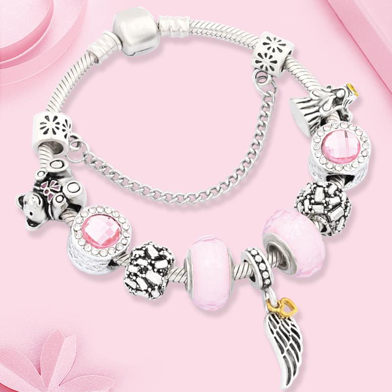 ブレスレット レディース 古銀 天使の翼 クマ チャーム かわいい ピンク 琉璃 ビーズ ブレスレット