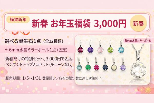 「こう丸バチカン枠に直結」へ変更を ご希望のお客様は必ずご覧下さい。 商 品 仕 様(クリスタル) 石 水晶(クリスタル)6mm・ミラーボールカット 材質 ラフィーネ・シルバー925 (SILVER 925/SV925) 全体サイズ 約10×6 mm(縦×横) バチカンの内径 約4×2mm(縦×横) 販売単位 1個 ※ペンダントトップのみ。 商 品 仕 様(選べる誕生石) 石:4mm・ラウンド ロードライトガーネット/アメジスト/ローズクォーツ/ペリドット/ブルートパーズ/淡水パール(丸玉) 石:3mm・ラウンド アクアマリン/エメラルド/ルビー/サファイア/オパール/タンザナイト 材質 ラフィーネ・シルバー925 (SILVER 925/SV925) 全体サイズ 4mmの石:約8×4mm(縦×横)/3mmの石:約7x4mm(縦×横) バチカンの内径 約4×2mm(縦×横) 販売単位 お選びいただいた1個 ※ペンダントトップのみ。 ご注意 天然石のため、色味・濃淡・内包物には個体差があります。モニター環境により実物と色味が異なる場合があります。 ※お支払い・配送方法については、↓の INFORMATION をご覧ください。新春 お年玉 3,000円 福袋ラフィーネ・シルバー925 クリスタルと選べるペンダントトップ 2点セット 【数量限定】 ラフィーネ・シルバー925の上質な輝きを、もっと気軽に知っていただきたくて、 新年のスタートにぴったりな数量限定の福袋をご用意しました! 固定は6mmミラーボールカットのクリスタル(水晶)。 そこに、選べる誕生石を1点プラスして、2点入りで3WAY(単体x2 + 重ねつけ)にお楽しみいただける、 とてもお得なセットです。 数量限定で1袋3,000円、早い者勝ちです!! セット内容(ペンダントトップ2点/※チェーンなし) 固定1点:6mmミラーボールカット・クリスタル(水晶)のペンダントトップ 選べる誕生石(サイズ2タイプ)のペンダントトップどれか1点: ・4mm:ロードライトガーネット(1月)、アメジスト(2月)、ローズクォーツ(4月)、 ペリドット(8月)、ブルートパーズ(11月)、淡水パール(6月) ・3mm :アクアマリン(3月)、エメラルド(5月)、ルビー(7月)、サファイア(9月)、 オパール(10月)、タンザナイト(12月) 合計2点で1セットです。 数量限定:各石なくなり次第終了です(販売1/5〜1月末予定) 「3WAY」に楽しめる“重ね着け” (1) クリスタルだけで 「魔除け」の力を持つパワーストーンでもあるクリスタル。 6mmのミラーボールカットを施したら、繊細で優しいきらめきのジュエルに。 (2)誕生石だけで その日の気分や誕生月で、色を楽しむ1粒ペンダント。 (3) 2点を重ね付けで きらめきxカラーのレイヤード。シンプル服でも一気に雰囲気が出ます。 2点セットなのに胸元は3通り。 使い回せるから、とてもお得なセットですよ。 重ね付けは、写真のように同じチェーンで横に並べても、別チェーンで長さ差をつけてもOK。 「光の主役」+「色のアクセント」で、胸元がぐっと魅力的に。 ※数量限定のため、気になる貴石はお早めに(各石ごとに限定数/なくなり次第終了) 固定:6mm ミラーボールカット クリスタル(水晶) クリアで繊細なきらめきはどんな服装にも合う「万能枠」です。 選べる誕生石ペンダントトップ(12種から1点) サイズは2タイプ(4mm、3mm)です。※サイズは選択できません。 ご注文時の選び方 ご注文時に「選べる誕生石」から1点をお選びください(各石ごとに在庫数が異なります)。 ・ 4mm ラウンドの誕生石(※淡水パールは4mm丸玉です) ロードライトガーネット(1月) / アメジスト(2月) / ローズクオーツ(4月) / ペリドット(8月) / ブルートパーズ(11月) / 淡水パール(6月) ・ 3mm ラウンドの誕生石 アクアマリン(3月) / エメラルド(5月) / ルビー(7月) / サファイア(9月) / オパール(10月) / タンザナイト (12月) ・淡水パールについて 淡水パールのみ、他の誕生石と素材・表情が異なります。天然素材のため個体差があります。 (注) 数量限定:各石、限定数に達し次第終了です。 販売期間・数量について 販売期間:1月5日-1月末(予定) 数量限定:各石の限定数に達し次第終了です。 ご確認ください ・ペンダントトップのみの販売です(チェーンは付属しません) ・天然石、淡水パールは色味や表情に個体差があります。 ・オパールは表面に個体差が出やすい石です。(色の出方を含めて個性としてお楽しみください) モアサナイトと貴石が選べる5,000円の福袋はこちらです