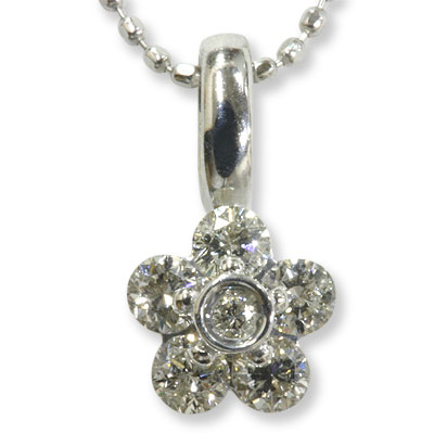 ■ チェーンをお求めの方はこちらからどうぞ ※チェーンだけをご購入いただくことはできませんのでご了承くださいペンダント※トップのみの販売です。ご注文の際、ご注意下さい。チェーンを必要なお客様は下のフォームから別途ご注文ください。【 仕様 】■本体素材[1]18Kホワイトゴールド製(サンプル=本体)[2]ダイヤモンド(約)2.5mm×5石[3]ダイヤモンド(約)2.0mm×1石[4]ダイヤモンド(約)1.6mm×1石[5]ダイヤモンド(約)1.3mm×1石■カラットダイヤモンド:(約)0.35ct(8石)※カラットは多少の前後がございます。■サイズトップ長:(約)21.0mmトップ幅:(約)7.7mmトップ厚:(約)4.8mmトップ重量:(約)2.01g※サイズにより重さは異なります。■メモ【ベーネ・ベーネのお約束】ジュエリー工房<ベーネ・ベーネ>でお作りするジュエリーにはニッケルを一切使用してございません。ご安心して身に着けていただくことができます。【天然石の証】天然石を使用しているためルースには個体差がございます。カラー、内包物は石の性質により、写真と異なる場合があります。また、お客さまがお使いのモニターの設定により見え方が異なります。ご了承くださいませ。“ベーネ・ベーネ”では粗悪品の素材は一切扱っておりません。ご不明な点はQ&Aをご参考下さいませ。■必ずお読み下さいませ※ルースの品質についての考え方※宝石(ルース)は天然のものですので大小にかかわらず、インクルージョン(=内包物)は必ず入っています。粗悪品はもちろん扱っておりませんが、特にモース硬度の低い石には10倍ルーペで確認いただける微細なキズ(チップ)、欠けなどが混じる場合もございます。ベーネ・ベーネでは宝飾のプロという観点からも、肉眼で認識の困難なキズ、欠けよりも全体の色味、輝きなど宝石としての品位に重点を置いてセレクションを行っております。以上を理由とする交換、または返品はお受けできません。ご了承くださいませ。※ページ写真についてサンプル撮影ではなるべく実物に近くなるよう留意しておりますが、撮影環境、天気、照明により実物と見え方が異なる場合がございます。何とぞご理解下さいますようお願いいたします。以上を理由とする交換、または返品はお受けできません。ご了承くださいませ。 Q&Aよくあるご質問※同梱発送についてのお願い※先にご購入頂いた支払い方法とと2回目以降のお支払い方法が異なる場合は、システムの都合上、同梱発送をお受けすることができません。ご注意くださいませ。【送料無料】ダイヤモンド8石で魅せる フラワーモチーフペンダントトップ ↑画像をクリックすると拡大してご覧いただけます胸元で大人の女の煌めき女らしさを主張するアイテムとして、人気を高めているモチーフとして、支持されているフラワーデザイン。経験を重ねてきた女性ともなると、可愛いだけで終わってしまうアイテムよりも、品格とグレードを持ったジュエリーを選びたいもの。朝露を受けてキラキラ輝く、愛らしくけなげに咲く可憐なダイヤモンドの花。身に着けることでポジティブになれそうな、知的な楽しさを感じられる爽やかな印象のペンダントトップです。ツタの葉に絡まった小さなお花から、ゆらゆらと揺れるダイヤモンドを6ピース留めたフェミニンなフラワーが、胸元を美しく飾ります。この個性的なキュートさ。そして、アンティーク感溢れたクラシカルなフォルム。大人の可愛らしさを表現させ、誰からも好感度をもたれるペンダントです。華麗に揺れるダイヤモンドに、大人流の魅力を引き出して、更なる美しさを咲かせて下さいね。 メインのフラワーは輝きを最大限に引き出してくれる“1サイドセッティング”ぐるっと取り巻く5石のダイヤモンドにはそれぞれひとつのツメしかなく、外側はダイヤモンドがむき出しのままです。より美しく魅せる為に、ベーネが考えた技ありペンダントです。 裏面裏側の繊細な部分までしっかり磨き上げています。 側面フラワーモチーフのカップに収まるダイヤモンドがご確認いただけます。 上部フラワー上部に2石のダイヤモンドをあしらって、魅せる動き感あるフラワー 下部フラワー6石のダイヤモンドで煌めくフラワー。 チェーンチェーンは取り外すことが出来る作りです。。最大値約3x2mmのチェーン穴です。↑各画像をクリックすると拡大してご覧いただけます ■K18グリーンゴールド 追加となりました。※グリーンゴールドはピアスポスト、キャッチはK18イエローゴールド仕様となります※チェーンはカットボールチェーンのみグリーンゴールド対応可能です■対応金種:K18ホワイトゴールド、K18イエローゴールド、K18ピンクゴールド、K18シャンパンゴールド、K18グリーンゴールド、K10ホワイトゴールド、K10イエローゴールド、K10ピンクゴールド、プラチナ900