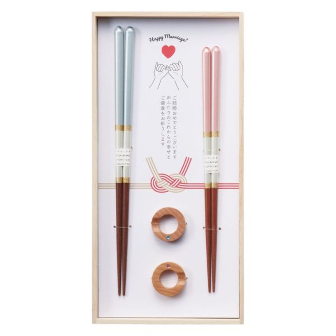 商品説明 お二人の新しい門出にぴったりの贈り物。 スワロフスキーが埋め込まれた箸置きと、滑り止め付きのおしゃれな塗箸がセットになった夫婦箸ギフトです。 ピンクとブルーのカラー展開で、若いご夫婦や新婚カップルへのプレゼントにおすすめ。友人や同僚、後輩へのカジュアルなお祝いにも適しています。 箸の持ち手は四角型、先端は丸く加工され、滑り止め付きで使いやすさにも配慮。 箸は食洗機に対応しており、日常使いにも便利です。 商品仕様 ●箸サイズ: ブルー:23cm ピンク:21cm ●箸置サイズ:約 直径3cm × 高さ0.8cm ●パッケージサイズ:約 14 × 27.5 × 2.5cm ●重さ(パッケージ含む):約140g 材質 箸本体:天然木(表面塗装:アクリルウレタン塗装) 箸置き:天然木(表面塗装:ウレタン塗装) 箸置き装飾:スワロフスキー 機能・特徴 持ち手:四角型 先端:丸形・滑り止め付き 箸のみ家庭用食洗機対応(※箸置きは非対応) 日本製(福井県小浜市産) ご注意 モニター環境により実際の色味と異なる場合がございます。 予告なくパッケージ・仕様が変更となる場合がございます。あらかじめご了承ください。 結婚祝いや記念日のギフトに。 実用性と華やかさを兼ね備えた、心を込めた贈り物です。