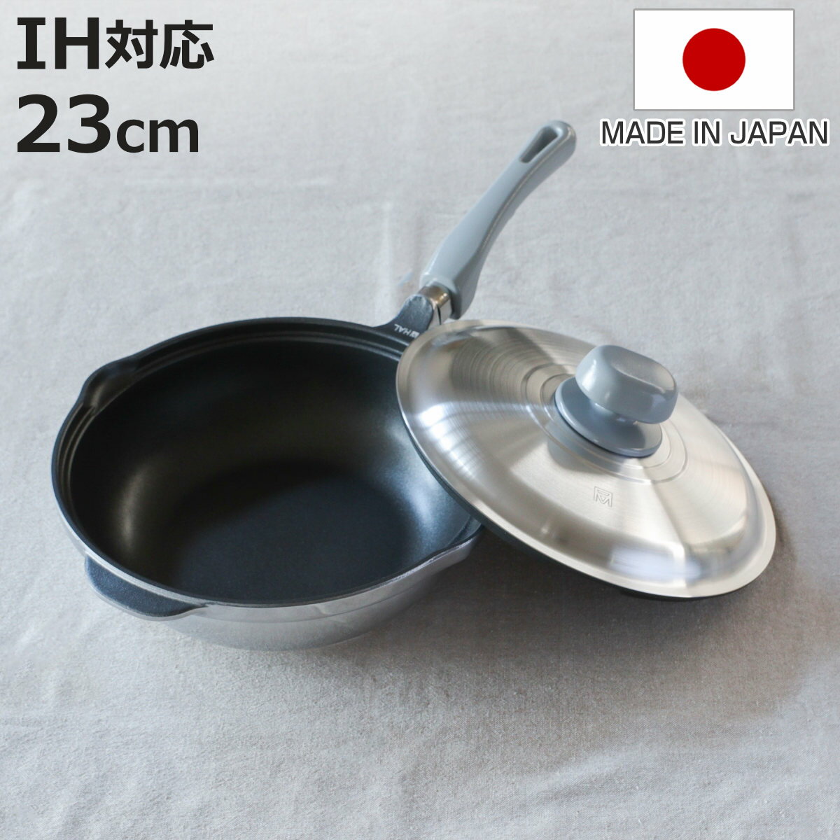 サイズ外寸:約 奥行46.8×高さ13.2(cm)内寸:約 高さ7(cm)内径:約 23(cm)鍋底の厚さ:5.5(mm)重量約 1.38kg容量満水容量:2.8L内容量1個材質【本体】アルミニウム合金製内面:ふっ素樹脂塗膜加工外側面:鏡面仕上げ外底面:特殊磁性膜加工+耐熱塗装【蓋】アルミニウム合金製内面:ふっ素樹脂塗膜加工外側面:鏡面仕上げ【取っ手・つまみ・座板】フェノール樹脂生産国日本製食器洗い乾燥機使用不可電子レンジ使用不可オーブン使用不可熱源IH・ガス火両対応注意事項※商品ページ内には別の商品を含む画像を使用しています。備考【炊飯可能量】お米3合まで区分返品・キャンセル区分(小型商品)ギフトラッピングページを見るHAL万能無水鍋23 23cm IH対応 日本製おすすめポイント※商品ページ内には別の商品を含む画像を使用しています。うまみを引き出すHAL万能無水鍋【23cm】無水調理は余分な水を加えず、素材の水分で調理をします。旨みや栄養分がぎゅっとつまった素材本来の美味しさが味わえます。少量の調味料と短い時間で調理できるので、食費やガス・電気代の節約にもつながります。栄養を逃さず、ヘルシーに無水調理は、素材に含まれているビタミンやミネラルなどの流出を防ぎます。少ない油と調味料で美味しく仕上がるので、ヘルシー志向の現代のライフスタイルにも適しています。ひとつで8通りの調理が可能炊く、蒸す、煮る、茹でる、焼く、炒める、揚げる、オーブン代わりの天火調理と、ひとつで8通りの使い方ができます。乾物以外は余計な水を加えず、素材にもともと含まれている水分や油分を活かし、旬の食材で調理すると豊かな風味や濃厚な味わいに驚きます。使いやすいフライパン形状調理からお手入れまで快適なふっ素樹脂加工を施しています。汚れが付きにくく、使用後はサッと洗って拭くだけで次の調理に移れます。炒めやすさを追求した側面のカーブにより、食材を返しやすく、混ぜる・炒める動作も軽やかに行えます。商品詳細ガス・IHなどさまざまな熱源に対応直火はもちろん、IHなどさまざまな熱源に対応しています。高い熱伝導率と底厚5.5mmが生む保熱性鉄の約3倍、ステンレスの約14倍、耐熱ガラスの約186倍の高い熱伝導率です。さらに、鍋底最大5.5mmの厚みのある本体との相乗効果で、側面まで蓄熱性と保温性に優れています。火の通りが早く、ムラなく均一に食材に火が通ります。アルミニウム鋳物の蓋本体と同じ厚手のアルミニウム鋳物の蓋で鍋全体の熱効率を高めています。蓋の裏面までふっ素樹脂加工を施しているため汚れが付きにくくお手入れも簡単です。注ぎ口と蓋の「HALマーク」を合わせるとすき間ができ、蒸気抜きや湯切りをスムーズに行えます。軽くて丈夫鉄や銅、ステンレスのわずか約1/3の比重で扱いやすく、普段使いのお鍋にぴったりです。ウォーターシール効果蓋と本体がかみ合わさる部分にウォーターシールと呼ばれる水分の膜をつくり、内部を密閉状態にするため、素材の持つ水分だけで調理できます。丈夫で持ちやすい持ち手と補助取っ手持ち手は丈夫な樹脂製です。ほどよいカーブを持たせることで、調理時や持ち運び時にも扱いやすいです。反対側には補助取っ手を備え、片手鍋の手軽さはそのままに、両手でも支えられます。シリーズ紹介万能無水鍋 23cm【▲このページの商品】万能無水鍋 26cm片手無水鍋(浅鍋・深鍋・ガラス蓋)関連キーワード:23センチ シンプル スタイリッシュ 直火対応 時短料理 時短調理 調理器具 キッチン用品 キッチンウェア 便利 手軽 役立つ おすすめ オススメ おしゃれ オシャレ お洒落 ギフト プレゼント 贈り物 母の日 新生活 LH20427関連商品はこちらHAL万能無水鍋26 26cm IH対応 日本30,250円HAL片手無水鍋16.5 16.5cm IH対26,730円KING無水鍋24 24cm IH対応 日本製19,580円KING無水鍋20 20cm IH対応 日本製17,380円KING無水鍋18 18cm IH対応 日本製15,180円KING無水鍋18 20 24 18cm 2015,180円?無加水鍋 18cm IH対応 クックシェア 軽5,180円無加水鍋 20cm IH対応 クックシェア 軽6,980円両手鍋 22cm IH対応 無水調理ができるセ6,980円両手鍋 20cm IH対応 無水調理ができるセ6,480円両手鍋 18cm IH対応 無水調理ができるセ5,980円両手鍋 24cm IH対応 セラミック加工 無5,880円