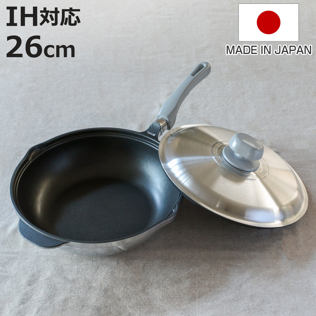サイズ外寸:約 奥行50.3×高さ13.7(cm)内寸:約 高さ7(cm)内径:約 26(cm)鍋底の厚さ:5.5(mm)重量約 1.58kg容量満水容量:3.5L内容量1個材質【本体】アルミニウム合金製内面:ふっ素樹脂塗膜加工外側面:鏡面仕上げ外底面:特殊磁性膜加工+耐熱塗装【蓋】アルミニウム合金製内面:ふっ素樹脂塗膜加工外側面:鏡面仕上げ【取っ手・つまみ・座板】フェノール樹脂生産国日本製食器洗い乾燥機使用不可電子レンジ使用不可オーブン使用不可熱源IH・ガス火両対応注意事項※商品ページ内には別の商品を含む画像を使用しています。備考【炊飯可能量】お米5合まで区分返品・キャンセル区分(小型商品)ギフトラッピングページを見るHAL万能無水鍋26 26cm IH対応 日本製おすすめポイント※商品ページ内には別の商品を含む画像を使用しています。うまみを引き出すHAL万能無水鍋【26cm】無水調理は余分な水を加えず、素材の水分で調理をします。旨みや栄養分がぎゅっとつまった素材本来の美味しさが味わえます。少量の調味料と短い時間で調理できるので、食費やガス・電気代の節約にもつながります。栄養を逃さず、ヘルシーに無水調理は、素材に含まれているビタミンやミネラルなどの流出を防ぎます。少ない油と調味料で美味しく仕上がるので、ヘルシー志向の現代のライフスタイルにも適しています。ひとつで8通りの調理が可能炊く、蒸す、煮る、茹でる、焼く、炒める、揚げる、オーブン代わりの天火調理と、ひとつで8通りの使い方ができます。乾物以外は余計な水を加えず、素材にもともと含まれている水分や油分を活かし、旬の食材で調理すると豊かな風味や濃厚な味わいに驚きます。使いやすいフライパン形状調理からお手入れまで快適なふっ素樹脂加工を施しています。汚れが付きにくく、使用後はサッと洗って拭くだけで次の調理に移れます。炒めやすさを追求した側面のカーブにより、食材を返しやすく、混ぜる・炒める動作も軽やかに行えます。商品詳細ガス・IHなどさまざまな熱源に対応直火はもちろん、IHなどさまざまな熱源に対応しています。高い熱伝導率と底厚5.5mmが生む保熱性鉄の約3倍、ステンレスの約14倍、耐熱ガラスの約186倍の高い熱伝導率です。さらに、鍋底最大5.5mmの厚みのある本体との相乗効果で、側面まで蓄熱性と保温性に優れています。火の通りが早く、ムラなく均一に食材に火が通ります。アルミニウム鋳物の蓋本体と同じ厚手のアルミニウム鋳物の蓋で鍋全体の熱効率を高めています。蓋の裏面までふっ素樹脂加工を施しているため汚れが付きにくくお手入れも簡単です。注ぎ口と蓋の「HALマーク」を合わせるとすき間ができ、蒸気抜きや湯切りをスムーズに行えます。軽くて丈夫鉄や銅、ステンレスのわずか約1/3の比重で扱いやすく、普段使いのお鍋にぴったりです。ウォーターシール効果蓋と本体がかみ合わさる部分にウォーターシールと呼ばれる水分の膜をつくり、内部を密閉状態にするため、素材の持つ水分だけで調理できます。丈夫で持ちやすい持ち手と補助取っ手持ち手は丈夫な樹脂製です。ほどよいカーブを持たせることで、調理時や持ち運び時にも扱いやすいです。反対側には補助取っ手を備え、片手鍋の手軽さはそのままに、両手でも支えられます。シリーズ紹介万能無水鍋 23cm万能無水鍋 26cm【▲このページの商品】片手無水鍋(浅鍋・深鍋・ガラス蓋)関連キーワード:26センチ シンプル スタイリッシュ 直火対応 時短料理 時短調理 調理器具 キッチン用品 キッチンウェア 便利 手軽 役立つ おすすめ オススメ おしゃれ オシャレ お洒落 ギフト プレゼント 贈り物 母の日 新生活 LH20427関連商品はこちらHAL万能無水鍋23 23cm IH対応 日本28,050円HAL片手無水鍋16.5 16.5cm IH対26,730円KING無水鍋24 24cm IH対応 日本製19,580円KING無水鍋20 20cm IH対応 日本製17,380円KING無水鍋18 18cm IH対応 日本製15,180円KING無水鍋18 20 24 18cm 2015,180円?無加水鍋 18cm IH対応 クックシェア 軽5,180円無加水鍋 20cm IH対応 クックシェア 軽6,980円両手鍋 20cm IH対応 無水調理ができるセ6,480円両手鍋 18cm IH対応 無水調理ができるセ5,980円両手鍋 22cm IH対応 無水調理ができるセ6,980円両手鍋 24cm IH対応 セラミック加工 無5,880円