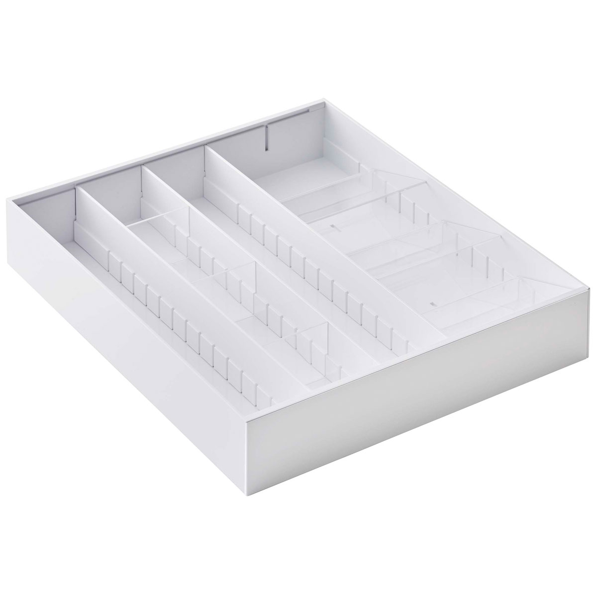 自分仕様にカスタマイズできて便利! 引き出しのサイズに合わせて横に6cmごとに伸縮できるカトラリーケース、TOWER 立体横伸縮カトラリーケース。3種類の仕切りで引き出しの中を自分仕様にカスタマイズできます。本体には、仕切りを約2cmごとに調整できる溝が付いています。 豊富な仕切り板付きで多用途に対応! 仕切り(大)は、カトラリーとキッチンツールなどを大きく仕分けます。仕切り(小)は、お弁当に使う小物や箸置きなどの収納に便利です。また、斜めの仕切りで、カトラリーを重ねて収納できるから、収納スペースをより効率よく使えます。 商品の情報 ・ブランド:YAMAZAKI(山崎実業)/日本 ・ジャンル:カトラリーケース ・主な素材:ABS樹脂(ケース、仕切り大)/PS樹脂(斜め仕切り、仕切り小)/シリコーン(滑り止め) ・生産国:中国 ・サイズ:約W297・356・415・474xD350xH550mm ・内寸サイズ:約W51・110・169・228xD338xH52mm(外ケース)/約W228xD338xH49mm(内ケース)/約W51mm(1ピッチ)/約W110mm(2ピッチ)/約W169mm(3ピッチ)/約W228mm(4ピッチ) ・重量:約1260g ・耐熱温度:約90℃ ・耐冷温度:約-40℃ ・内容物:本体 x1/仕切り(大) x3/仕切り(小) x6/斜め仕切り x6 この商品の仲間たち 山崎実業 TOWER 立体横伸縮カトラリーケース ホワイト 山崎実業 TOWER 立体横伸縮カトラリーケース ブラック