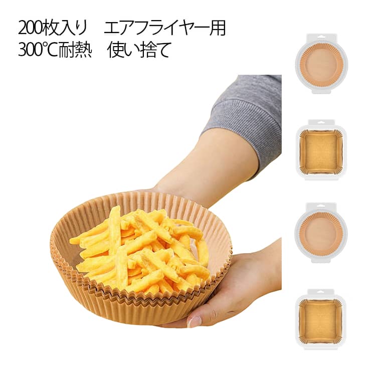 エアフライヤー調理用紙は、敷いて終わったら捨てるだけで、ノンフライヤーのバスケットを汚さずに調理できます。 食品グレードの高級パーチメント紙を使用し、防水性、耐油性、耐熱性に優れています。肉を入れてもぼろぼろになったり、肉汁や調味料が漏れたりしません。エアフライヤー以外でも蒸し器、オーブンでもつかえます。このまま生地を流し込んで蒸しパン、オーブンでのパン焼きに使えます。また、電子レンジで、冷凍ものや揚げ物の温め直しに便利です。 サイズ 200枚(プラスチックシール包装) サイズについての説明 サイズ:16×4.5×20cm(丸型) 16×4.5×20cm(四角型) 20×4.5×24cm(丸型) 20×4.5×24cm(四角型) 23×4.5×27cm(四角型) 23×4.5×27cm(丸型) ※測定方法によって誤差が生じますので、予めご了承下さい。 素材 紙(食品用シリコンオイル加工) 色 16×4.5×20cm(丸型) 16×4.5×20cm(四角型) 20×4.5×24cm(丸型) 20×4.5×24cm(四角型) 23×4.5×27cm(四角型) 23×4.5×27cm(丸型) 備考 ●サイズ詳細等の測り方はスタッフ間で統一、徹底はしておりますが、実寸は商品によって若干の誤差(1cm?3cm )がある場合がございますので、予めご了承ください。 ●製造ロットにより、細部形状の違いや、同色でも色味に多少の誤差が生じます。 ●パッケージは改良のため予告なく仕様を変更する場合があります。 ▼商品の色は、撮影時の光や、お客様のモニターの色具合などにより、実際の商品と異なる場合がございます。あらかじめ、ご了承ください。 ▼生地の特性上、やや匂いが強く感じられるものもございます。数日のご使用や陰干しなどで気になる匂いはほとんど感じられなくなります。 ▼同じ商品でも生産時期により形やサイズ、カラーに多少の誤差が生じる場合もございます。 ▼他店舗でも在庫を共有して販売をしている為、受注後欠品となる場合もございます。予め、ご了承お願い申し上げます。 ▼出荷前に全て検品を行っておりますが、万が一商品に不具合があった場合は、お問い合わせフォームまたはメールよりご連絡頂けます様お願い申し上げます。速やかに対応致しますのでご安心ください。