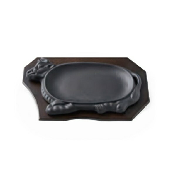 牛型のかわいいデザインのステーキ皿です。業務用でも人気があり、ガス火、IHどちらの熱源にも対応しています。ジュージューと焼ける音が食欲をそそります。木台付きです。食洗機は使用できません。