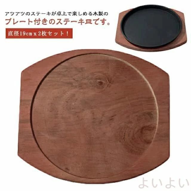 直径19cmx2枚セット!アツアツのステーキが卓上で楽しめる木製のプレート付きのステーキ皿です。保温性が高く冷めにくい鉄鋳物製で、ガス火はもちろん、IHクッキングヒーターやオーブンにも対応。鉄鋳物ならではの優れた耐久性を持ち、焦げ付きもゴシゴシ擦れます。 サイズ 2枚セット サイズについての説明 直径19cm 素材 鉄鋳物 色 直径19cm 備考 ●サイズ詳細等の測り方はスタッフ間で統一、徹底はしておりますが、実寸は商品によって若干の誤差(1cm〜3cm )がある場合がございますので、予めご了承ください。 ●製造ロットにより、細部形状の違いや、同色でも色味に多少の誤差が生じます。 ●パッケージは改良のため予告なく仕様を変更する場合があります。 ▼商品の色は、撮影時の光や、お客様のモニターの色具合などにより、実際の商品と異なる場合がございます。あらかじめ、ご了承ください。 ▼生地の特性上、やや匂いが強く感じられるものもございます。数日のご使用や陰干しなどで気になる匂いはほとんど感じられなくなります。 ▼同じ商品でも生産時期により形やサイズ、カラーに多少の誤差が生じる場合もございます。 ▼他店舗でも在庫を共有して販売をしている為、受注後欠品となる場合もございます。予め、ご了承お願い申し上げます。 ▼出荷前に全て検品を行っておりますが、万が一商品に不具合があった場合は、お問い合わせフォームまたはメールよりご連絡頂けます様お願い申し上げます。速やかに対応致しますのでご安心ください。