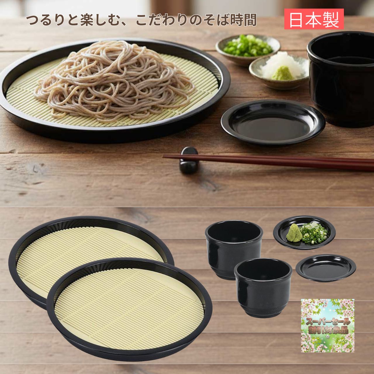 商品情報素材/材質●材質:表面塗装/ウレタン塗装、素地/ABS樹脂(耐熱温度80度)、すのこ/ポリプロピレン(耐熱温度120度)原産国:日本 サイズ/寸法/内容/重量●サイズ そば皿=(約):外径220×高さ22mm そば猪口=外径85×高さ70mm●内容:そば皿2枚(スノコ付) ×2個 そば猪口(薬味皿付) ×2個●重量:そば皿=1枚あたり約160g そば猪口=1個あたり約80g 商品説明ざるそば皿(スノコ付き)とそば猪口のペアセット2人使うのであればこれで決まり。そば皿は天ぷらやお寿司の盛り付けにも使用できます。※他店舗でも販売しておりますので、ご注文のタイミングによってはお取り寄せになる場合もあります。注意モニター発色の具合により色合いが異なる場合がございます。日本製 ざる そば皿 丸型 すのこ付 & そば猪口 薬味皿付 ペアセット ざるうどん ざるそば 食器 そば食器セット ざるそば用の丸形お皿と蕎麦猪口&薬味皿 各2個のペアセット、すのこはプラスチック製で衛生的 2