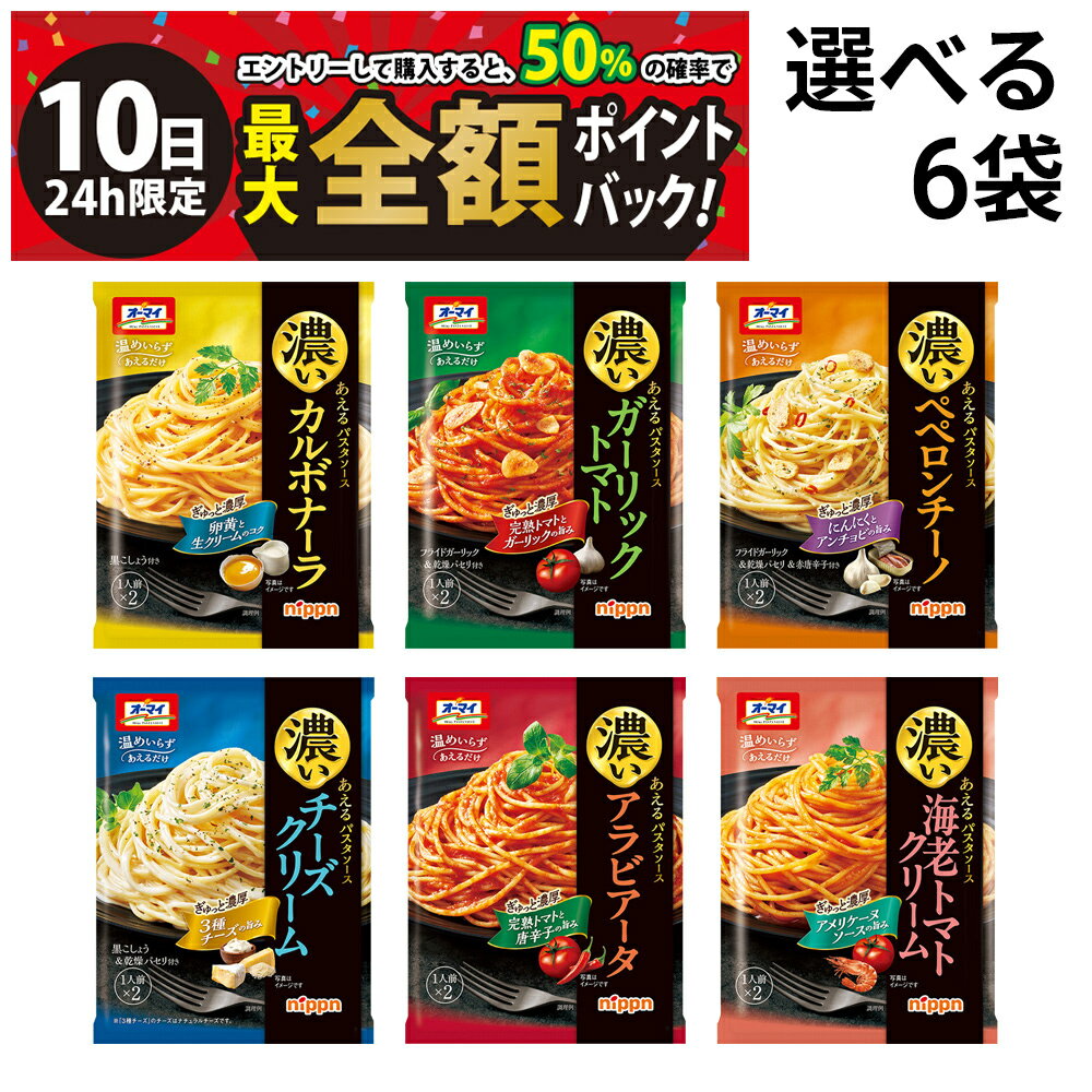 ニップン オーマイ 濃いあえるパスタソース【 選べる6個 】アソートセットです。 ゆでたパスタにまぜるだけの簡単パスタソース。 温めずに食べられるので、バーべキューやキャンプ、登山などのアウトドアでもお楽しみいただけます。 パスタソース以外に料理の調味ソースとしてもご活用いただけます。 セット内容 オーマイ 濃いあえるパスタソース 6袋 (以下の種類からお好きな組み合わせで6つお選びください) ●オーマイ 濃いあえるパスタソース カルボナーラ 86g(2食入り)×1個 ●オーマイ 濃いあえるパスタソース ガーリックトマト 80g(2食入り)×1個 ●オーマイ 濃いあえるパスタソース ペペロンチーノ 49.2g(2食入り)×1個 ●オーマイ 濃いあえるパスタソース チーズクリーム 70g(2食入り)×1個 ●オーマイ 濃いあえるパスタソース アラビアータ 76g(2食入り)×1個 ●オーマイ 濃いあえるパスタソース 海老トマトクリーム 80g(2食入り)×1個 商品の説明 ●濃いあえるパスタソース カルボナーラ カルボナーラは卵黄とチーズの旨みを生クリームでなめらかにまとめました。 ●濃いあえるパスタソース ガーリックトマト ガーリックトマトは完熟トマトの旨みと香ばしいにんにくの風味が食欲をそそります。 ●濃いあえるパスタソース ペペロンチーノ ペペロンチーノは隠し味のアンチョビの旨みが濃いにんにくソースを際立てます。 ●濃いあえるパスタソース チーズクリーム チーズクリームはカマンベール、マスカルポーネ、パルメザンチーズの旨み重なるおいしさです。 ●濃いあえるパスタソース アラビアータ アラビアータは唐辛子のピリッとした辛さが完熟トマトの旨みを引き立てます。 ●濃いあえるパスタソース 海老トマトクリーム 海老トマトクリームはアメリケーヌソースとトマトの旨みが詰まったクリーミーなおいしさです。 注意事項 ※お召し上がりの際にはお手元の商品パッケージの表示内容を必ずご確認ください。 ※商品のリニューアル等により、お手元に届いた商品と原材料や内容量が異なる場合があります。 ※開封後はすぐに召し上がってください。 ※直射日光を避け、常温で保存してください ▼他のパスタソースを見る▼ カテゴリー 食品 調味料