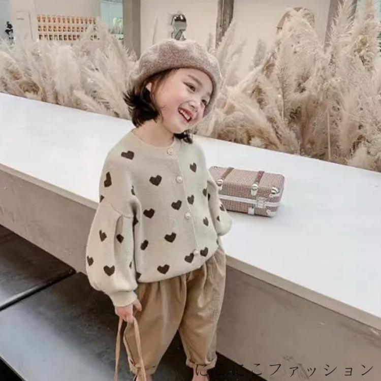 ハート柄が女の子らしいニットカーディガン。ボリュームのある袖と、ゆったりとしたシルエットが今っぽくかわいい◎伸縮性があり、チクチク感もなく、柔らかく肌触りが良いです?羽織りカーディガンとして、前ボタントップスとして、様々な着方が楽しめるのも大きなポイント!普段使いはもちろん、通園通学にもピッタリな一枚です。 サイズ 80 90 100 110 120 130 サイズについての説明 80 着丈35cm 袖丈29cm 身長70-80cm 90 着丈37cm 袖丈31cm 身長80-90cm 100 着丈39cm 袖丈33cm 身長90-100cm 110 着丈42cm 袖丈35cm 身長100-110cm 120 着丈45cm 袖丈37cm 身長110-120cm 130 着丈48cm 袖丈39cm 身長120-130cm 140 着丈51cm 袖丈41cm 身長130-140cm 素材 ニット 色 写真色 備考 ●サイズ詳細等の測り方はスタッフ間で統一、徹底はしておりますが、実寸は商品によって若干の誤差(1cm〜3cm )がある場合がございますので、予めご了承ください。 ●商品の色は、撮影時の光や、お客様のモニターの色具合などにより、実際の商品と異なる場合がございます。あらかじめ、ご了承ください。●製品によっては、生地の特性上、洗濯時に縮む場合がございますので洗濯時はご注意下さいませ。▼色味の強い製品によっては他の衣類などに色移りする場合もございますので、速やかに(脱水、乾燥等)するようにお願いいたします。 ▼生地によっては摩擦や汗、雨などで濡れた時は、他の製品に移染する恐れがございますので、着用の際はご注意下さい。▼生地の特性上、やや匂いが強く感じられるものもございます。数日のご使用や陰干しなどで気になる匂いはほとんど感じられなくなります。