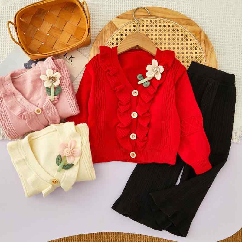 ・カテゴリ: キッズニットセットアップ・性別: 女の子・対象年齢: 3?8歳・対応身長: 100?140cm・スタイル: スウィート・厚さ: 普通・袖丈: 長袖・留め具: シングルボタン・柄: 花柄・主な素材: 綿80%・毛糸の太さ: 普通・ネックライン: クルーネック・カラー展開: ホワイト、ピンク・サイズ展開: 100cm、120cm