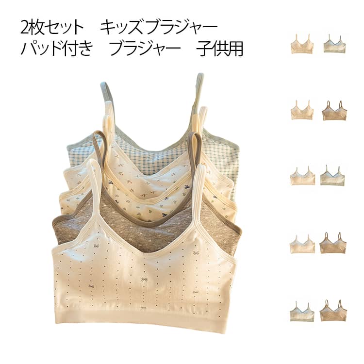 カップがインナーと一体になるのでパッドがズレにくいハーフトップ!伸縮性のある生地が体にピッタリフィットして胸が揺れにくい設計です。ソフトカップがインナーと一体になっており、初めてのブラジャーにもオススメです。シンプルなデザインで、学校での着替えでも目立たず、普段使いやスクール用に幅広くご利用いただけます。 サイズ M L XL サイズについての説明 M 体重参考(37.5-47.5kg) L 体重参考(47.5-57.5kg) XL 体重参考(57.5-65kg) ※測定方法によって誤差が生じますので、予めご了承下さい。 素材 綿 色 2枚セット01 2枚セット02 2枚セット03 2枚セット04 2枚セット05 2枚セット06 2枚セット07 2枚セット08 2枚セット09 2枚セット10 備考 ●サイズ詳細等の測り方はスタッフ間で統一、徹底はしておりますが、実寸は商品によって若干の誤差(1cm〜3cm )がある場合がございますので、予めご了承ください。 ●商品の色は、撮影時の光や、お客様のモニターの色具合などにより、実際の商品と異なる場合がございます。あらかじめ、ご了承ください。 ●製品によっては、生地の特性上、洗濯時に縮む場合がございますので洗濯時はご注意下さいませ。 ▼色味の強い製品によっては他の衣類などに色移りする場合もございますので、速やかに(脱水、乾燥等)するようにお願いいたします。 ▼生地によっては摩擦や汗、雨などで濡れた時は、他の製品に移染する恐れがございますので、着用の際はご注意下さい。 ▼生地の特性上、やや匂いが強く感じられるものもございます。数日のご使用や陰干しなどで気になる匂いはほとんど感じられなくなります。