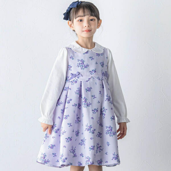 [型番:1103-60517]細糸と太糸で織られたさりげない凸凹感がおしゃれな生地のワンピース。繊細なバラのお花をプリントしたBeBeオリジナルファブリックです。程よいハリ感と大きめにとったタックで可愛く広がるAラインになっています。透明感のある淡いパープルの色合いがとても上品。ウエスト切替のスカラップにはリボンをのせて細部まで可愛い1着となっています。小物使いに濃い色合いを一つ足すと引き締まった印象になりおすすめです。【BeBe(べべ)】”LOVE MODERN” 少しおませで、生意気なヨーロピアンカジュアルの提案。時代性・流行性をとらえ、ベーシックでもワンポイントを施した遊び心、楽しさを盛り込んでいます。シンプルだけど、こだわりのあるオリジナリティーを重視しています。■カラー:パープル系110cm:身幅32.5 着丈62 肩幅26120cm:身幅34.5 着丈68 肩幅27.5130cm:身幅36.5 着丈73.5 肩幅29※( )で表記されている数字はヌードサイズです。ヌードサイズとは衣服を身につけない身体のサイズです。お客様ご自身の身体サイズと比較してお選びください。 ■素材: パープル系:(表)ポリエステル100% (裏)ポリエステル100% ■お手入: ドライ >>商品のお取り扱い方法 ■原産国: 日本【日本製】スカラップ切替ローズプリントワンピース(110~130cm)/ベベ(BeBe)パープル系画面上と実物では、多少色具合が異なって見える場合がございます。