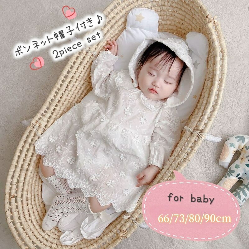 お揃いのボンネット帽子付きのベビー用セレモニードレスです。 刺繍とレースがたっぷりあしらわれていてとってもロマンティック♪ 赤ちゃんとの退院やお宮参りなどセレモニーシーンにぴったりですね★ 【サイズについて】 画像をご参照下さい。 ※帽子はフリーサイズとなります。 高さ紐部分まで約16cm、レース部分約6センチ 幅 約22cm 平置き採寸となっておりますので多少差が出る場合がございます。 【カラーについて】 生産ロットにより柄の出方や色の濃淡が異なる場合がございます。 お使いのモニターや撮影時の光の加減などにより 画像と実際の商品のカラーが異なる場合もございます。 予告なしにカラーやデザインなどの変更がある場合もございます。 【素材について】 95%綿 5%ポリエステル 【補足説明】 商品の性質上、手洗いでのお洗濯をお勧めしております。