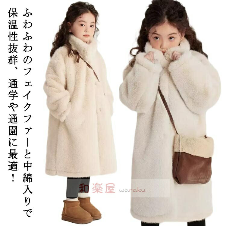 ふわふわのフェイクファーと中綿入りで保温性抜群、通学や通園に最適!ふわふわで柔らかなエコァーを使用し、羽織るだけで暖かい。きれいめからカジュアルコーデまで合わせやすいおしゃれなデザイン。可愛いだけでなく、厚手でとても暖かいです。防寒、保温に今年冬子供ににも喜ばれること間違いなし・デイリーユースにも、アウトドアにもお洒落な女の子のファーコート。 サイズ 120 130 140 150 160 サイズについての説明 【120】参考身長105-115cm 【130】参考身長115-125cm 【140】参考身長125-135cm 【150】参考身長135-145cm 【160】参考身長145-155cm 素材 ポリエステル 色 アイボリー 備考 ●サイズ詳細等の測り方はスタッフ間で統一、徹底はしておりますが、実寸は商品によって若干の誤差(1cm〜3cm )がある場合がございますので、予めご了承ください。 ●商品の色は、撮影時の光や、お客様のモニターの色具合などにより、実際の商品と異なる場合がございます。あらかじめ、ご了承ください。 ●製品によっては、生地の特性上、洗濯時に縮む場合がございますので洗濯時はご注意下さいませ。 ▼色味の強い製品によっては他の衣類などに色移りする場合もございますので、速やかに(脱水、乾燥等)するようにお願いいたします。 ▼生地によっては摩擦や汗、雨などで濡れた時は、他の製品に移染する恐れがございますので、着用の際はご注意下さい。 ▼生地の特性上、やや匂いが強く感じられるものもございます。数日のご使用や陰干しなどで気になる匂いはほとんど感じられなくなります。