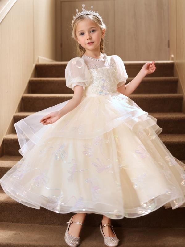 ・カテゴリ: 子供用ドレス・対象年齢: 3〜8歳・性別: 女の子・加工: シアリング・スタイル: プリンセス・主な素材: ポリエステル 50%・裏地: ポリエステル 50%・カラー展開: シャンパン・サイズ展開: 110cm, 120cm, 130cm, 140cm, 150cm, 160cm