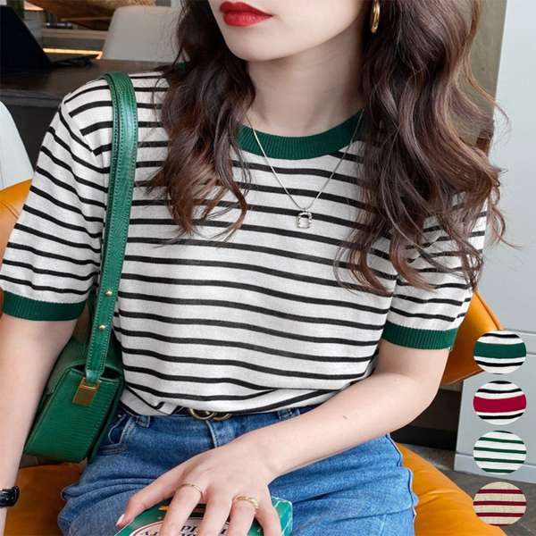 大人可愛い 春夏 配色ニットTシャツ カジュアル 丸首サマーニット インスタ映え 夏服 おしゃれ 薄手ニットソー 韓国風ニットカットソー夏 涼しいニット着回し プルオーバーニットマルチボーダー×配色リブが目を惹く半袖ニットトップス。やわらかな肌ざわりと、軽やかな着心地が魅力。襟ぐりや袖口の配色がアクセントになり、コーデに程よい抜け感をプラス。デニムやワイドパンツと合わせて、カジュアルに着こなすのがおすすめ。素材:レーヨン89%+ナイロン11%カラー:ブラック1(襟グリーン)/ブラック2(襟レッド)/グリーン/レッドサイズ:ワンサイズ着丈:約52cm 肩幅:約32cm 袖丈:約23cm ゆき:約39cm 身幅:約44cm 胸囲:約88-114cm裏地:なし伸縮性:あり透け感:なし生産国:中国※すべて平置きサイズです(採寸方法違いより、多少の誤差がございますので、ご了承ください)。※海外輸入品のため、商品の細部仕様は多少異なる場合がございます。予めご了承の上、ご注文お願い致します。商品管理番号:2DAIWEI-003返品・交換について購入後の交換は受け付けておりません。予めご了承ください。返品を希望される場合は購入履歴一覧の「ショップへの問い合わせ」よりお問い合わせください。=========================複数配送先指定について1件の注文に対して、異なる住所への配送は対応出来かねます。恐れ入りますが、異なる住所へ配送をご希望の場合、配送先毎に分けて注文いただきますようお願い申し上げます。【トップスWOMEN】ブラック1(襟グリーン) ブラック2(襟レッド) グリーン レッド ワンサイズ 素材:レーヨン89%+ナイロン11%ブラック1(襟グリーン) ブラック2(襟レッド) グリーン レッド