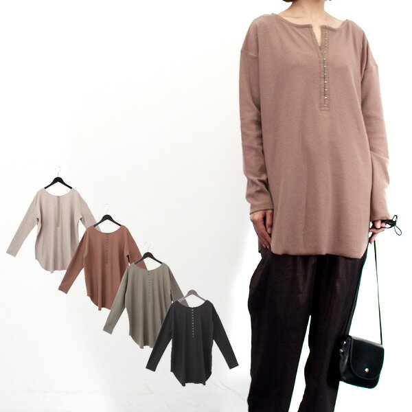 カットソー 起毛 リブ ヘンリーネック 2WAY 前後着用可能 長袖 無地 ホックテープ 冬 トップス レディース ライトベージュ ブラウン カーキ ブラック【カラー】ライトベージュ モカ カーキ ブラック【サイズ】着丈78cm 肩幅58cm バスト116cm 袖丈53cm 袖口20cm 裾周り120cm【素材】本体: ポリエステル97% ポリウレタン3%ホックテープ部分:綿100%※モデル身長160cm、前後着用可能、生産国:中国(注意事項)ご覧になっているモニター・PC環境により実際の商品と色味がことなって見える場合がございます。<<お取り寄せ商品のご注文についてこちらをご確認下さい>>※在庫について※当該商品は複数ショップと在庫を共有している為、在庫更新のタイミングにより、在庫切れの場合やむをえずキャンセルさせていただく可能性があります。起毛変形リブの素材感が魅力のトップスが新登場!ホックテープが個性的なポイント。前後着用可能な2WAYデザインです。