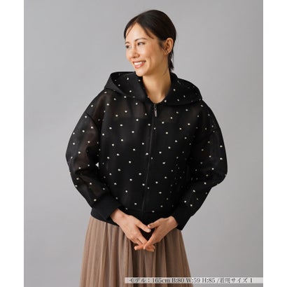 チャーミングなドット刺繍を施した、立体感のあるシアー素材のジャケット。ビッグフードがインパクトたっぷり。袖口や裾はリブで切り替え、心地よいフィット感をもたせています。シルエットはドロップショルダーでゆったりと仕上げ、リラクシーな着心地を実現しました。フロントはお好みに応じて開きの調整が可能となるダブルジップ仕様。シンプルなパンツやスカートに合わせるだけで、コーディネートを個性たっぷりに引き立ててくれるデザインです。------------------------------------<着用シーズン>秋<伸縮性>あり<透け感>あり<ポケット>なし<生地の厚さ>やや薄手<お取扱い方法>ウォッシャブル(手洗い可) -------------------------------------※商品の色味は、撮影場所や光のあたり具合、お客様のお使いの機器により色味が違って見える場合がございます。予めご了承ください。【製品寸法】1 : バスト:106, ゆき丈:76.5, 着丈:51.5【素材】<本体>基布:ポリエステル100.0% ししゅう上糸:ポリエステル78.0% ナイロン22.0% ししゅう下糸:ポリエステル100.0% <リブ地>:コットン96.0% ポリウレタン4.0%こちらはアウトレット品です。主にはシーズン落ちの新品になりますが、中には細かな傷やシワ、若干の色落ち等がある場合がございます(訳あり品を除く)。1 : 【着丈】51.5cm / 【胸囲】106cm