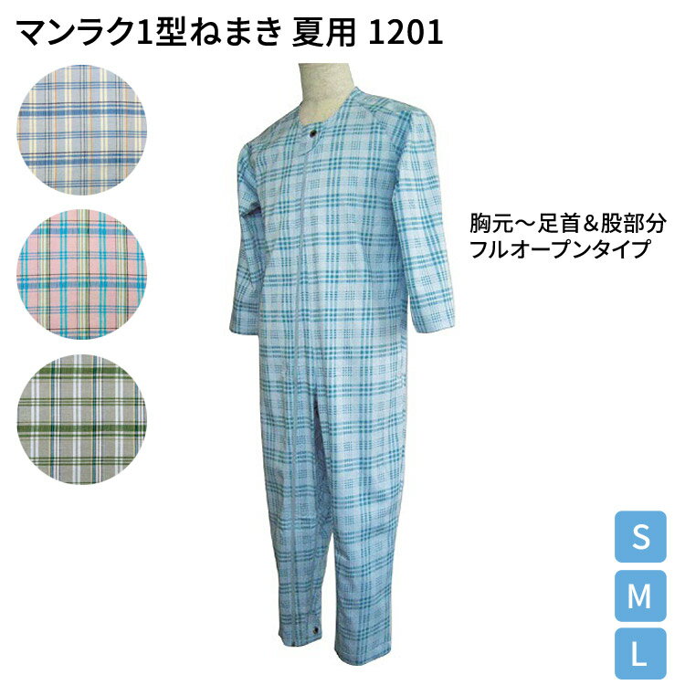 介護寝巻きマンラク1型ねまき夏用1201SML萬楽│介護ねまきパジャマつなぎねまきつなぎタイプ高齢者介護衣類フルオープンタイプ介護用品介護パジャマお年寄り老人シニア在宅介護病院老人ホーム特殊ホック