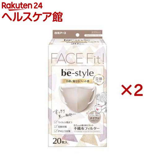 お店TOP>衛生医療>マスク>小さめマスク>女性用マスク>ビースタイル 立体タイプ ふつうサイズ ミルクティーベージュ (20枚入×2セット)【ビースタイル 立体タイプ ふつうサイズ ミルクティーベージュの商品詳細】●顔にフィットして小顔に魅せる、すっきり美しい輪郭に●メイクがつきにくい●ふわっとやさしい肌ざわりの口もと素材(エアスルー素材)●印象的な目もとを演出するラウンドカット●アゴのラインをすっきりみせるスマートカット●耳が痛くないふんわり幅広耳ひも●口もとに空間ができるから息がラク●ハートのワンポイントつき●色:大人可愛いベージュ【使用方法】(1)マスクを袋から一枚ずつ取り出します。(2)ハートがある方を上にしてマスクを着用します。【規格概要】・素材本体・フィルタ部:ポリプロピレン、ポリエチレン、ポリエステル耳ひも部:ナイロン、ポリウレタン・サイズ138*105mm(タテ*ヨコ)折りたたみ時のサイズ【注意事項】・本品は有害な粉塵・ガス等を防ぐ目的には使用できません。・乳幼児の手の届くところに置かないでください。・皮フに異常がある場合や、異常があらわれた場合には使用を中止してください。・着用中、臭いで気分が悪くなった場合には使用を中止してください。・使いきりタイプですので洗って再利用しないでください。汚れたら新しいものと交換してください。・衛生面から1日1枚のご使用をおすすめします。・対象用途以外に使用しないでください。・外箱のふたを閉めて清潔な場所に保管し、早めにご使用ください。・一度使用したマスクは、袋内に戻さないでください。・使用後は地方自治体の区分に従って捨ててください。【原産国】中国【ブランド】ビースタイル【発売元、製造元、輸入元又は販売元】白元アース※説明文は単品の内容です。リニューアルに伴い、パッケージ・内容等予告なく変更する場合がございます。予めご了承ください。・単品JAN:4902407582461白元アース110-0015 東京都台東区東上野2-21-1403-5681-7691広告文責:楽天グループ株式会社電話:050-5577-5042[マスク/ブランド:ビースタイル/]