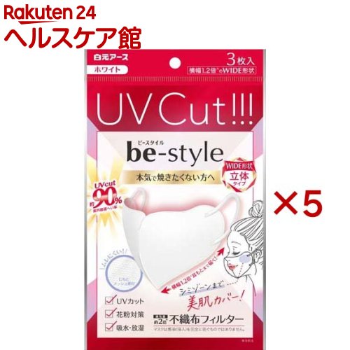 お店TOP>衛生医療>マスク>機能性マスク>UVカットマスク>ビースタイル UVカットマスク ホワイト (3枚入×5セット)【ビースタイル UVカットマスク ホワイトの商品詳細】●目もとやシミゾーンの頬骨周辺、頬までしっかりカバーします。・横幅1.2倍のワイド形状※メーカー比・口もとに空間ができて、唇にふれにくい●しっかりカバー&快適なつけ心地です。・Uカット約90%:紫外線カット素材を使用。UVA・UVBをカット・通気量約2倍:通気性のよいフィルターで息がラク※メーカー比●吸水放湿/口もとメッシュ・汗を吸って逃がすので、ムレにくく爽やか・さらっとした肌ざわり●耳ひもは耳が痛くないふんわり幅広仕様です。●色:ホワイト【使用方法】(1)マスクを袋から一枚ずつ取り出します。(2)マスクの左右にある印を上にしてマスクを着用します。【規格概要】・素材本体・フィルタ部:ポリプロピレン、ポリエチレン、ポリエステル耳ひも部:ナイロン、ポリウレタン・サイズ130*130mm(タテ*ヨコ)折りたたみ時のサイズ【注意事項】・本品は有害な粉塵・ガス等を防ぐ目的には使用できません。・乳幼児の手の届くところに置かないでください。・皮フに異常がある場合や、異常があらわれた場合には使用を中止してください。・着用中、臭いで気分が悪くなった場合には使用を中止してください。・使いきりタイプですので洗って再利用しないでください。汚れたら新しいものと交換してください。・衛生面から1日1枚のご使用をおすすめします。・対象用途以外に使用しないでください。・袋を閉じて清潔な場所に保管し、早めにご使用ください。・一度使用したマスクは、袋内に戻さないでください。・使用後は地方自治体の区分に従って捨ててください。【原産国】中国【ブランド】ビースタイル【発売元、製造元、輸入元又は販売元】白元アース※説明文は単品の内容です。リニューアルに伴い、パッケージ・内容等予告なく変更する場合がございます。予めご了承ください。・単品JAN:4902407581983白元アース110-0015 東京都台東区東上野2-21-1403-5681-7691広告文責:楽天グループ株式会社電話:050-5577-5043[マスク/ブランド:ビースタイル/]