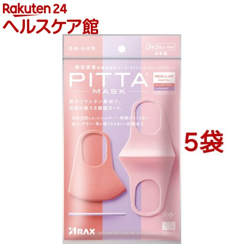 お店TOP>衛生医療>マスク>機能性マスク>抗菌マスク>ピッタ・マスク レギュラー パステル (15枚入(3枚3色入*5袋セット))お一人様20セットまで。【ピッタ・マスク レギュラー パステルの商品詳細】●息がしやすい。●耳が痛くならない。●密着して隙間が出来ない。●5回洗って使えます。●抗菌加工。●UVカット機能付き。●花粉捕集率99%。●レギュラーサイズのかわいいピンク系3色入。【使用方法】・マスクを内袋から1枚ずつ取り出します。(1)マスクの上下を確認して、左右に広げます。(2)耳かけ部分を引っ張って、マスクを両耳にかけます。(3)隙間なく密着させるため軽くマスクの上から押さえます。【ピッタ・マスク レギュラー パステルの原材料】ポリウレタン【規格概要】・対象:花粉、かぜ、ホコリ等・抗菌剤の種類:無機系抗菌剤【注意事項】・マスクは感染(侵入)を完全に防ぐものではありません。・乳児や呼吸器に異常がある方、自らの意思により本品を着脱することができない方には使用しないでください。・金属に対しアレルギー症状がある方、またはアレルギーが疑われる方は使用しないでください。・本品は有害な粉塵やガス等が発生する場所でのご使用はできません。・皮フに異常がある場合や、異常が現れた場合はただちに使用を中止してください。・マスクを着用中、臭いで気分が悪くなった場合には使用を中止してください。・乳幼児の手の届かない場所に保管をしてください。・高温多湿な場所、直射日光の当たる場所での保管は避けてください。・酸性及びアルカリ性の洗剤液で洗浄しますと、劣化する原因となりますのでご注意ください。・個人差により、眼鏡がくもることがありますので、運転の際などは十分ご注意ください。・火気のそばでのご使用はおやめください。・マスクを強く引っ張りすぎると破れる恐れがあります。・使用後は地方自治体の区分に従って捨ててください。【原産国】日本【ブランド】ピッタ・マスク(PITTA MASK)【発売元、製造元、輸入元又は販売元】アラクス※説明文は単品の内容です。お使いのモニター環境によって、実際にお届けになる商品と掲載している商品画像の色味が異なる場合がございます。予めご了承ください。商品に関するお電話でのお問合せは、下記までお願いいたします。(アラクスお客様相談室)医薬品:0120-225-081チェックワン相談室:052-951-2503チェックワンLH相談室:052-962-2203マスク相談室:052-951-8880アセニフタ:052-951-7210受付9:00〜16:30(土・日・祝日を除く)リニューアルに伴い、パッケージ・内容等予告なく変更する場合がございます。予めご了承ください。・単品JAN:4987009157330アラクス460-0002 愛知県名古屋市中区丸の内3丁目2-26※お問い合わせ番号は商品詳細参照広告文責:楽天グループ株式会社電話:050-5577-5043[マスク/ブランド:ピッタ・マスク(PITTA MASK)/]