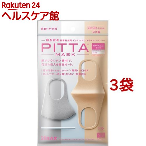 お店TOP>衛生医療>マスク>機能性マスク>抗菌マスク>ピッタ・マスク スモール シック (3枚3色入*3袋セット)お一人様20セットまで。【ピッタ・マスク スモール シックの商品詳細】●息がしやすい。●耳が痛くならない。●密着して隙間が出来ない。●5回洗って使えます。●抗菌加工。●UVカット機能付き。●花粉捕集率99%。●スモールサイズのシックな3色入。【使用方法】・マスクを内袋から1枚ずつ取り出します。(1)マスクの上下を確認して、左右に広げます。(2)耳かけ部分を引っ張って、マスクを両耳にかけます。(3)隙間なく密着させるため軽くマスクの上から押さえます。【ピッタ・マスク スモール シックの原材料】ポリウレタン【規格概要】・対象:花粉、かぜ、ホコリ等・抗菌剤の種類:無機系抗菌剤【注意事項】・マスクは感染(侵入)を完全に防ぐものではありません。・乳児や呼吸器に異常がある方、自らの意思により本品を着脱することができない方には使用しないでください。・金属に対しアレルギー症状がある方、またはアレルギーが疑われる方は使用しないでください。・本品は有害な粉塵やガス等が発生する場所でのご使用はできません。・皮フに異常がある場合や、異常が現れた場合はただちに使用を中止してください。・マスクを着用中、臭いで気分が悪くなった場合には使用を中止してください。・乳幼児の手の届かない場所に保管をしてください。・高温多湿な場所、直射日光の当たる場所での保管は避けてください。・酸性及びアルカリ性の洗剤液で洗浄しますと、劣化する原因となりますのでご注意ください。・個人差により、眼鏡がくもることがありますので、運転の際などは十分ご注意ください。・火気のそばでのご使用はおやめください。・マスクを強く引っ張りすぎると破れる恐れがあります。・使用後は地方自治体の区分に従って捨ててください。【原産国】日本【ブランド】ピッタ・マスク(PITTA MASK)【発売元、製造元、輸入元又は販売元】アラクス※説明文は単品の内容です。商品に関するお電話でのお問合せは、下記までお願いいたします。(アラクスお客様相談室)医薬品:0120-225-081チェックワン相談室:052-951-2503チェックワンLH相談室:052-962-2203マスク相談室:052-951-8880アセニフタ:052-951-7210受付9:00〜16:30(土・日・祝日を除く)リニューアルに伴い、パッケージ・内容等予告なく変更する場合がございます。予めご了承ください。・単品JAN:4987009157361アラクス460-0002 愛知県名古屋市中区丸の内3丁目2-26※お問い合わせ番号は商品詳細参照広告文責:楽天グループ株式会社電話:050-5577-5042[マスク/ブランド:ピッタ・マスク(PITTA MASK)/]