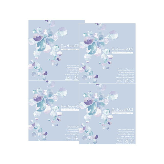 ※左右2箱ずつ、計4箱のお届けとなります。 Pure Natural PLUS 1day (1)紫外線カット 様々なトラブルの原因となる紫外線をカットする成分を配合。 (2)うるおい成分配合 保存液にヒアルロン酸の約2倍の保水力を持つMPCポリマーを配合。 (3)薄型のエッジデザイン 厚みを抑えることで異物感を軽減。 (4)高含水レンズ 水分を多く含むため、目の負担が少ないやさしいレンズ。 (5)優れた装用感 素材がやわらかいので目になじみやすい。 交換時期 1日交換型(ワンデータイプ) 商品名 Pure Natural PLUS 55%(ピュアナチュラルプラス55%) 販売名 ピュアナチュラル55UVM 容量 30枚入り スペック BC(ベースカーブ): 8.70 P(度数): -0.50〜-6.00(0.25ステップ)、 -6.50〜-10.00(0.50ステップ) DIA(サイズ): 14.2mm 含水率 55% 医療機器承認番号 22900BZX00392A10 製造販売元 粧美堂様々なセットをご用意致しました。ご使用頻度や、ご予算によってお好みのセットをお選び下さい。 画像クリックで各販売ページが表示されます。 セット内容 30枚入り×1箱 30枚入り×2箱 30枚入り×4箱 30枚入り×6箱 30枚入り×8箱 30枚入り×10箱 30枚入り×12箱 使用期間※左右別度数の場合 約0.5ヶ月(15日分) 約1ヶ月(30日分) 約2ヶ月(60日分) 約3ヶ月(90日分) 約4ヶ月(120日分) 約5ヶ月(150日分) 約6ヶ月(180日分)