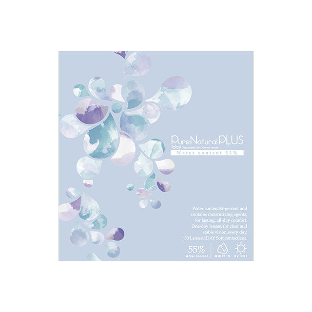 Pure Natural PLUS 1day (1)紫外線カット 様々なトラブルの原因となる紫外線をカットする成分を配合。 (2)うるおい成分配合 保存液にヒアルロン酸の約2倍の保水力を持つMPCポリマーを配合。 (3)薄型のエッジデザイン 厚みを抑えることで異物感を軽減。 (4)高含水レンズ 水分を多く含むため、目の負担が少ないやさしいレンズ。 (5)優れた装用感 素材がやわらかいので目になじみやすい。 交換時期 1日交換型(ワンデータイプ) 商品名 Pure Natural PLUS 55%(ピュアナチュラルプラス55%) 販売名 ピュアナチュラル55UVM 容量 30枚入り スペック BC(ベースカーブ): 8.70 P(度数): -0.50〜-6.00(0.25ステップ)、 -6.50〜-10.00(0.50ステップ) DIA(サイズ): 14.2mm 含水率 55% 医療機器承認番号 22900BZX00392A10 製造販売元 粧美堂様々なセットをご用意致しました。ご使用頻度や、ご予算によってお好みのセットをお選び下さい。 画像クリックで各販売ページが表示されます。 セット内容 30枚入り×1箱 30枚入り×2箱 30枚入り×4箱 30枚入り×6箱 30枚入り×8箱 30枚入り×10箱 30枚入り×12箱 使用期間※左右別度数の場合 約0.5ヶ月(15日分) 約1ヶ月(30日分) 約2ヶ月(60日分) 約3ヶ月(90日分) 約4ヶ月(120日分) 約5ヶ月(150日分) 約6ヶ月(180日分)