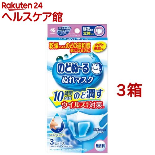 お店TOP>衛生医療>マスク>保湿マスク・アロママスク>ぬれマスク・保湿マスク>のどぬ〜る ぬれマスク 昼夜兼用 立体タイプ 無香料 (3セット入*3箱セット)お一人様20セットまで。【のどぬ〜る ぬれマスク 昼夜兼用 立体タイプ 無香料の商品詳細】●スチーム効果で約10時間※1のどをうるおし続けます。●フィルター中の水分が呼吸によって蒸気となりのどをうるおします。●たっぷりの水分で、朝までうるおいが持続します。※1使用環境によって持続時間は異なります。●高密度のフィルター機能で、空気中のウイルス飛沫・花粉をカットします。・ウイルス飛沫ろ過効率試験:VFE試験・バクテリア飛沫ろ過効率試験:BFE試験・花粉捕集効率試験・微粒子捕集効率試験:PFE試験●会話がしやすい立体マスクと特殊形状ぬれフィルター●マスク:口元がゆったりした立体マスクを採用しています。●ぬれフィルター:呼吸を妨げないように、左右にぬれフィルターを分けています。●繊維が細く、やわらかい不織布を採用しているので気持ちいい肌触りです。●ソフトなワイドゴムで耳への負担を和らげます。・オフィス・学校で・電車で・家の中で・乾燥によるのどの違和感 気になる方に・かぜの季節にも・10時間加湿・のど潤す・ウイルス飛沫対策※※マスクのフィルター効果により・耳が痛くなりにくいワイドゴム・無香料・加湿マスク※マスクは感染(侵入)を完全に防ぐものではありません【使用方法】1.マスク上部の入り口から左右ひとつずつフィルターをセットする 。※点線のある方が下 2.鼻からあごまでを覆うようにマスクを装着する。【のどぬ〜る ぬれマスク 昼夜兼用 立体タイプ 無香料の原材料】本体:ポリプロピレン耳ゴム:ポリエステル、ポリウレタンぬれフィルター:パルプレーヨン、ポリエチレン、ポリプロピレン箱:紙内袋:ポリプロピレンフィルター袋:アルミ、ポリプロピレン【成分】ぬれフィルター:パラベン、ヨウ素化合物配合【規格概要】マスクサイズ:(約)縦13.5cm*横11.5cm※折りたたみ時【注意事項】・衛生上および機能上、マスクとぬれフィルターの使用は1回限りとし、再使用しない。・ぬれフィルターは使用直前に開封する。・乳幼児や呼吸器に異常のある方には使用しない。・肌に傷、はれもの、湿しんなど異常がある場合は使用しない。・使用中や使用後に赤み、はれ、かゆみ、刺激などの異常があらわれた場合は使用を中止する。・有毒な粉塵・ガス等を防ぐ目的では使用しない。・マスクのニオイで気分が悪くなったり、息苦しくなった場合は使用を中止する。・乳幼児、認知症の方の手の届かないところに保管する。・自らの意思により本品を着脱することができない方は使用しない。【原産国】マスク:中国/ぬれフィルター:日本【ブランド】のどぬ〜る(のどぬーる)【発売元、製造元、輸入元又は販売元】小林製薬※説明文は単品の内容です。商品に関するお電話でのお問合せは、下記までお願いいたします。受付時間9:00-17:00(土・日・祝日を除く)健康食品・サプリメント:0120-5884-02歯とお口のケア:0120-5884-05衛生雑貨用品・スキンケア・ヘアケア:0120-5884-06芳香・消臭剤・水洗トイレのお掃除用品:0120-5884-07台所のお掃除用品・日用雑貨・脱臭剤:0120-5884-08リニューアルに伴い、パッケージ・内容等予告なく変更する場合がございます。予めご了承ください。・単品JAN:4987072058671小林製薬541-0045 大阪府大阪市中央区道修町4-4-10※お問合せ番号は商品詳細参照広告文責:楽天グループ株式会社電話:050-5577-5042[マスク/ブランド:のどぬ〜る(のどぬーる)/]