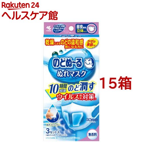 お店TOP>衛生医療>マスク>保湿マスク・アロママスク>ぬれマスク・保湿マスク>のどぬ〜る ぬれマスク 昼夜兼用 立体タイプ 無香料 (3セット入*15箱セット)お一人様20セットまで。【のどぬ〜る ぬれマスク 昼夜兼用 立体タイプ 無香料の商品詳細】●スチーム効果で約10時間※1のどをうるおし続けます。●フィルター中の水分が呼吸によって蒸気となりのどをうるおします。●たっぷりの水分で、朝までうるおいが持続します。※1使用環境によって持続時間は異なります。●高密度のフィルター機能で、空気中のウイルス飛沫・花粉をカットします。・ウイルス飛沫ろ過効率試験:VFE試験・バクテリア飛沫ろ過効率試験:BFE試験・花粉捕集効率試験・微粒子捕集効率試験:PFE試験●会話がしやすい立体マスクと特殊形状ぬれフィルター●マスク:口元がゆったりした立体マスクを採用しています。●ぬれフィルター:呼吸を妨げないように、左右にぬれフィルターを分けています。●繊維が細く、やわらかい不織布を採用しているので気持ちいい肌触りです。●ソフトなワイドゴムで耳への負担を和らげます。・オフィス・学校で・電車で・家の中で・乾燥によるのどの違和感 気になる方に・かぜの季節にも・10時間加湿・のど潤す・ウイルス飛沫対策※※マスクのフィルター効果により・耳が痛くなりにくいワイドゴム・無香料・加湿マスク※マスクは感染(侵入)を完全に防ぐものではありません【使用方法】1.マスク上部の入り口から左右ひとつずつフィルターをセットする 。※点線のある方が下 2.鼻からあごまでを覆うようにマスクを装着する。【のどぬ〜る ぬれマスク 昼夜兼用 立体タイプ 無香料の原材料】本体:ポリプロピレン耳ゴム:ポリエステル、ポリウレタンぬれフィルター:パルプレーヨン、ポリエチレン、ポリプロピレン箱:紙内袋:ポリプロピレンフィルター袋:アルミ、ポリプロピレン【成分】ぬれフィルター:パラベン、ヨウ素化合物配合【規格概要】マスクサイズ:(約)縦13.5cm*横11.5cm※折りたたみ時【注意事項】・衛生上および機能上、マスクとぬれフィルターの使用は1回限りとし、再使用しない。・ぬれフィルターは使用直前に開封する。・乳幼児や呼吸器に異常のある方には使用しない。・肌に傷、はれもの、湿しんなど異常がある場合は使用しない。・使用中や使用後に赤み、はれ、かゆみ、刺激などの異常があらわれた場合は使用を中止する。・有毒な粉塵・ガス等を防ぐ目的では使用しない。・マスクのニオイで気分が悪くなったり、息苦しくなった場合は使用を中止する。・乳幼児、認知症の方の手の届かないところに保管する。・自らの意思により本品を着脱することができない方は使用しない。【原産国】マスク:中国/ぬれフィルター:日本【ブランド】のどぬ〜る(のどぬーる)【発売元、製造元、輸入元又は販売元】小林製薬※説明文は単品の内容です。商品に関するお電話でのお問合せは、下記までお願いいたします。受付時間9:00-17:00(土・日・祝日を除く)健康食品・サプリメント:0120-5884-02歯とお口のケア:0120-5884-05衛生雑貨用品・スキンケア・ヘアケア:0120-5884-06芳香・消臭剤・水洗トイレのお掃除用品:0120-5884-07台所のお掃除用品・日用雑貨・脱臭剤:0120-5884-08リニューアルに伴い、パッケージ・内容等予告なく変更する場合がございます。予めご了承ください。・単品JAN:4987072058671小林製薬541-0045 大阪府大阪市中央区道修町4-4-10※お問合せ番号は商品詳細参照広告文責:楽天グループ株式会社電話:050-5577-5042[マスク/ブランド:のどぬ〜る(のどぬーる)/]