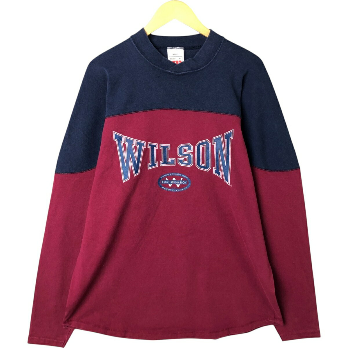 商品詳細 ブランド・Wilson・ウィルソン・ 特徴・クルーネック(丸首)・長袖・ツートーン・ラグランスリーブ・ヴィンテージ・ モデル/形状・ロングTシャツ ロンT・ 素材・コットン:100%・ 色・ボルドー・ネイビー系 紺色・ 柄・プリント・ 生産国・USA製・ 年代・90年代・ サイズ・表記サイズ:XL・着丈:78cm・身幅:59.5cm・裄丈:104cm・袖丈(脇下計測):66cm・ コンディション・B・ カテゴリ・メンズ・トップス・Tシャツ・長袖Tシャツ・ 商品番号・eaa540522・ 取扱店・・ スタッフコメントWilson ロングTシャツ ロンT / 商品番号 eaa540522 USEDですので使用感などございますが、まだまだご愛用していただけます。 古着という事をご理解の上ご注文よろしくお願いします。※状態は当社独自の基準です。 表記サイズ着丈身幅裄丈袖丈(脇下計測) XL(※着用感、表記サイズは目安です。)78cm59.5cm104cm66cm ※測定値の若干の誤差はご了承下さい。サイズガイドはこちら ブランドWilsonウィルソン 特徴クルーネック(丸首) / 長袖 / ツートーン / ラグランスリーブ / ヴィンテージモデル/形状ロングTシャツ ロンT素材コットン:100%色ボルドー / ネイビー系 紺色柄プリント生産国USA製年代90年代カテゴリ長袖Tシャツ商品番号eaa540522取扱店 ウィルソンの他の商品を見る長袖Tシャツの他の商品を見る