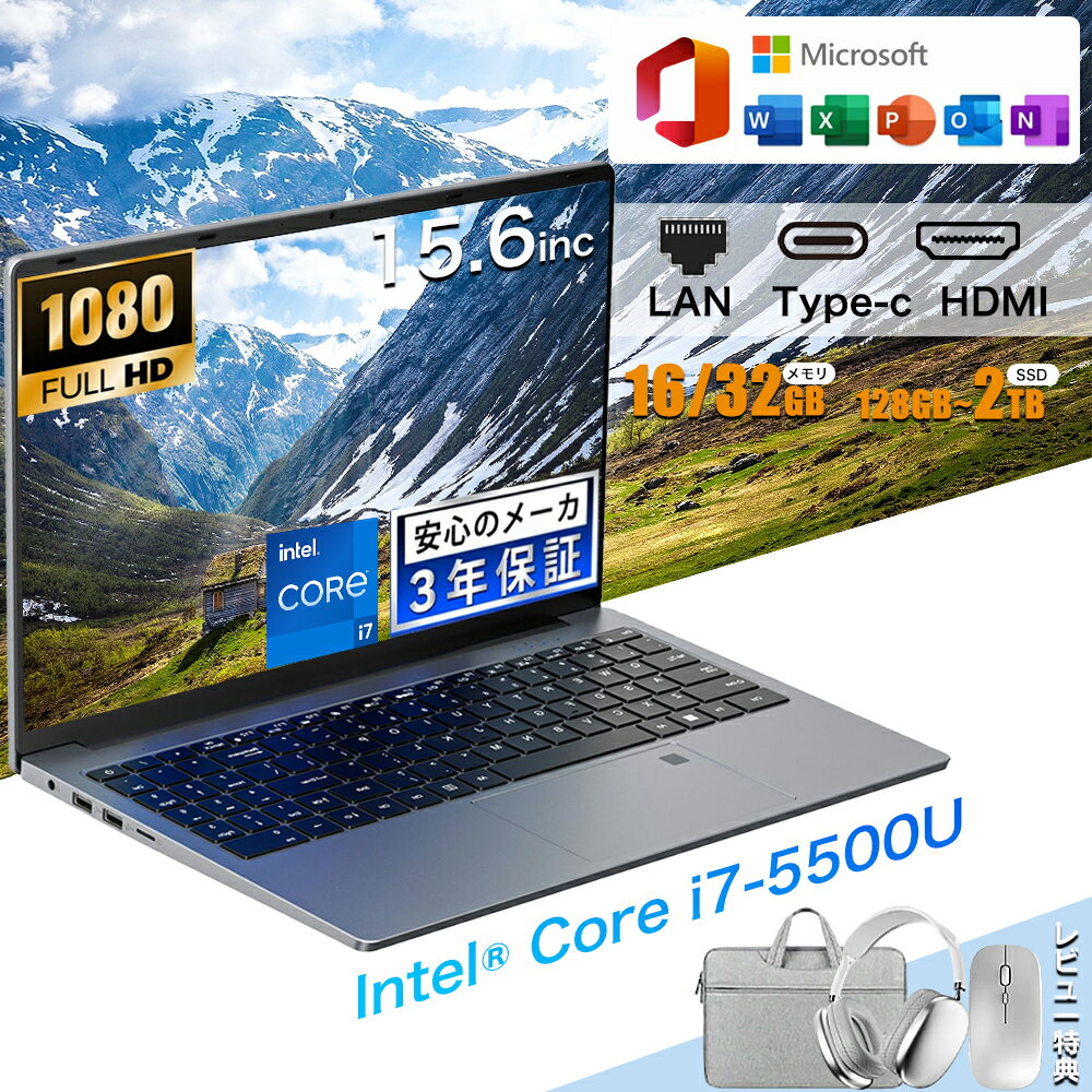 商品情報【パワフル インテルCore i7-5500U プロセッサー搭載+高速放熱冷却フアン搭載】ノートパソコンは Core i7-5500Uプロセッサー搭載、最大3.0GHzまで達し、2コア4スレッドで動作し、高い処理能力を発揮します。大量のデータを処理する場合や、複数のタスクを同時に実行する場合でも快適に動作します!高性能で低消費電力pcです。ビジネス向けの高度な機能を備えているパソコン。高速の操作を実現しながら、発熱もちゃんと抑える高回転速の静音冷却フアンも搭載されているため、熱による引き起こされるフリーズ、シャットダウン、ブルースクリーンなどの問題が前世代より大幅に削減し、PCの安定した動作を保証します。このノート パソコンに大容量バッテリーが内蔵して長時間の駆動が可能で、ユーザーにとって持続的な作業や移動中の利用が簡単になります。オフィス作業や個人用にコスパ最高のノートPCです。【 16GB/32メモリ+SSD 128GB~2TBストレージ】LPDDR3 RAMの搭載により、SSDストレージのデータ読み書き速度はHDDをはるかに上回り、パソコンの起動速度を大幅に短縮させます。アプリの読み書きが迅速に行われるため、時間が大幅に節約されて思い切りパソコンを活用できます。更に、このパソコン ノートはストレージ拡張性に優れ、microSD カードリーダー端子も搭載、最大128GBまでサポート。容量不足の心配はありません。【15.6インチ+IPS液晶スクリーン】14インチノートパソコンの画面でディスプレイが大きくなると一度に映せる情報量が多くなって作業性が向上します。15.6インチ パソコン画面比率90%、16:9の画面比、180°まで開け、広範囲の視野を提供します。非光沢ディスプレイデザインは目の疲れを軽減し、解像度【1920*1080フルHD】IPS液晶スクリーンは、狭いフレームと高い画面対ボディ比を備えており、ユーザーに広くクリアな視界を提供します、IPS非光沢ディスプレイを搭載し、反射が少ないぶん目が疲れにくい、内蔵100万画素Webカメラとスピーカー、オンライン会議やビデオ通話で友人や家族とコミュニケーションを取ることができます。テレワーク・zoom・ウェブブラウジング・映画鑑賞、写真編集、デザイン作業など、よりリアルで生き生きとした画像を求めるユーザーには、15.6インチlaptop1080Pディスプレイが最適です。【インタフェース】usb3.0 *3(より高速なデータ転送インタフェース、外部ハードディスクなどの接続)イヤホンジャック(ヘッドホンやスピーカーを接続してオーディオコンテンツを楽しむためのインタフェース)SDカード(カメラやスマートフォンなどから写真や動画などのファイルを転送するためのメモリーカードスロット)type-c(フル機能のインタフェース、高速データ転送、充電、ビデオ出力などに対応した多機能ポート)HDMI(外部ディスプレイと接続して高品質なビデオや音声出力を実現するポートです。)RJ45 (lanケーブルを接続して、転送速度が速くて安定しています)はバックライトキーボード、フロントネットワークカメラなど一連の優れた特徴を一身に集めて、ユーザーに総合的で便利な使用体験を提供します。夜間でも簡単に操作できるバックライトキーボード、高解像度のウェブカメラによる高品質の画像など、スマートなデザインと優れた機能を兼ね備えたノートパソコンです。さまざまなシーンで簡単かつ効率的に利用できます。【軽量+Win 11 Pro/Office 搭載】薄型で持ち運びや収納に便利で、高い携帯性を提供しています。最新のWin 11 professionalが標準仕様となっており、Office にも実装済みです。初期設定不要ですぐに使えます。文書作成や表計算など、ビジネスシーンで必要な応用が網羅されています。会社や大学などで使用がわかっている場合は、MS Office付きのモデルをお勧めします。Word、Excel、PowerPointなど、仕事に必要なソフトはすべてプリインストールされています。【品質保証と技術】本製品は購入後3年間保証されます。日本語のお客様サービスを提供します。故障した場合は、修理または交換が可能です。安心して長くお使いいただけるよう、確かな品質保証と技術サポートを提供しております。おすすめ商品 【2026新品】ノートパソコン パソコンoffice付き 15.6 型 フルHD液晶 高性能CPU Core i7-5500U メモリ 16/32GB SSD 128GB~ 2TB 指紋認証 冷却ファzン ビジネス 初心者向け 初期設定済 パソコWindows11 Pro ノートPC PSE認証済 三年保証 最新OS 日本語配列キーボード テレワーク 学生向け WEBカメラ 無線 Bluetooth 送料無料 無線 Wi-Fi 持ち運び 在宅勤務 テレワーク 大容量バッテリー4500mAh 5