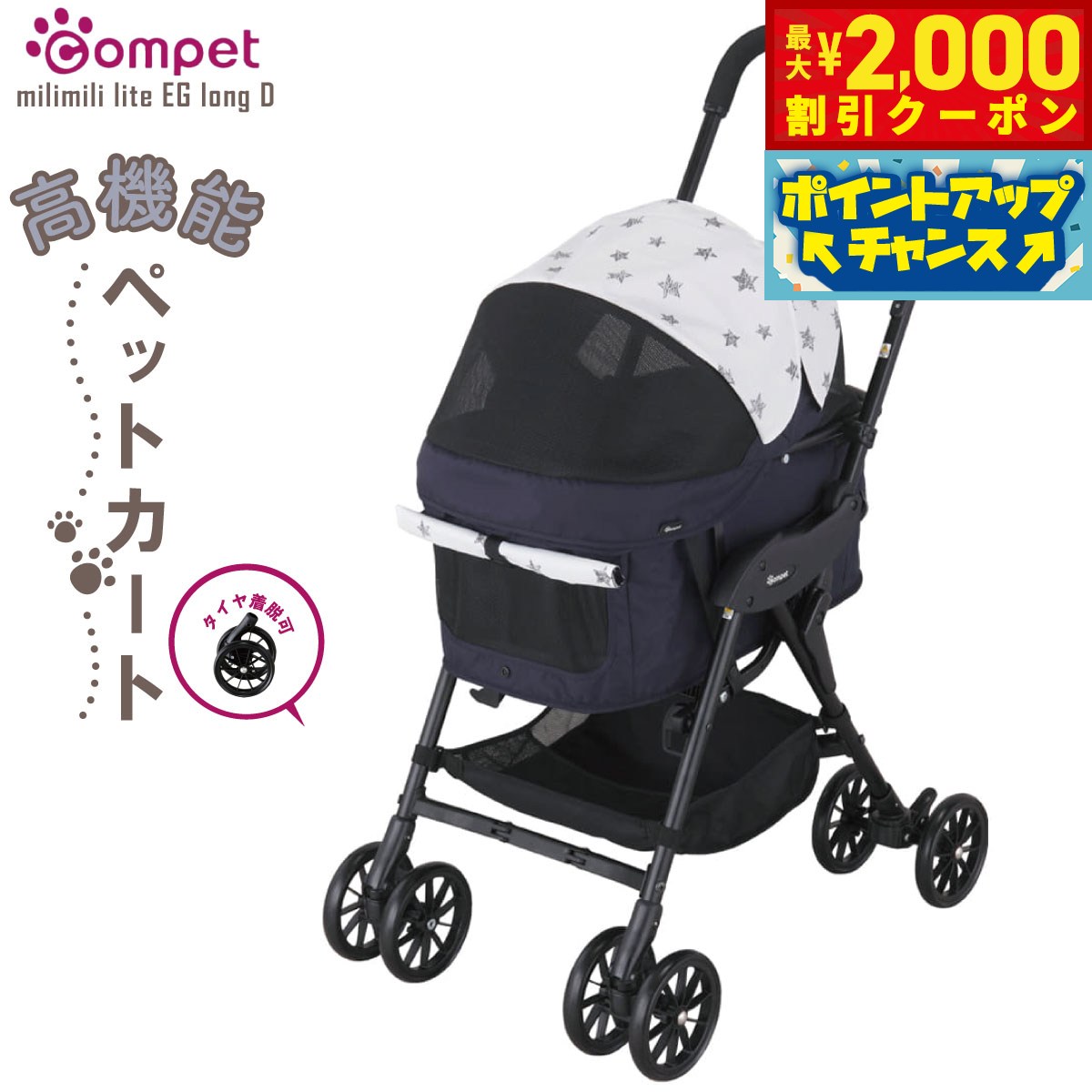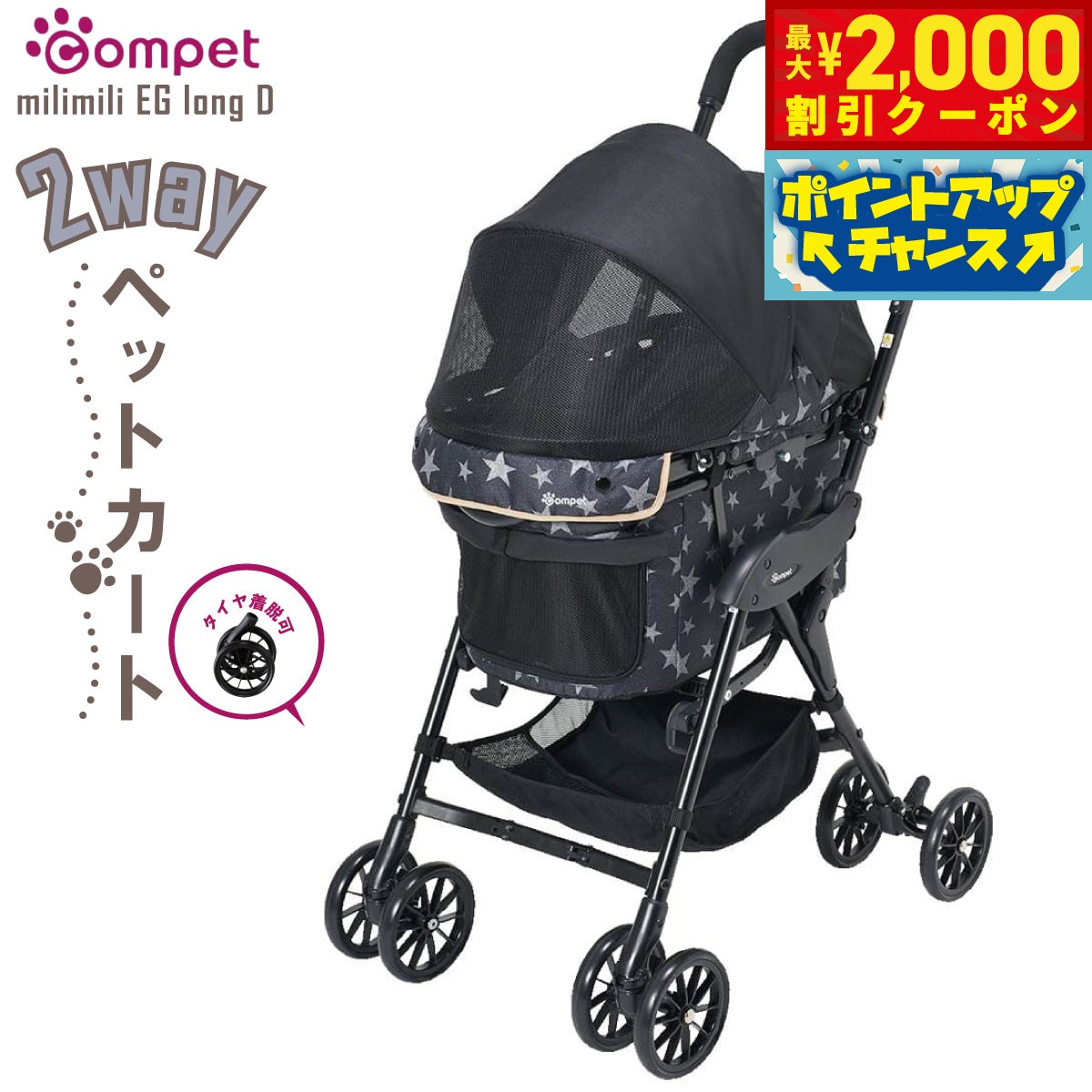 人気のミリミリEGロングに、タイヤが着脱可能なタイプが登場。メンテナンスがしやすくなり、お気に入りのペットカートを、より長く・快適にご使用いただけます!商品名コムペット ペットカート ミリミリEGロングDブランドCOMPET耐荷重耐荷重:15kg(2匹まで、犬専用)、荷物カゴ耐荷重:3kg大きさ使用時:W515×D750×H1007mm、折畳時:W390×D225×H1005mm、キャリー内寸(幌を除く):W270×D550×H250mm、ウェルカムウィンドー:D290×H165mm 【ここがポイント】●タイヤが着脱できるニューモデル登場!人気のミリミリ EG ロングに、タイヤが着脱可能なタイプが登場。メンテナンスがしやすくなり、お気に入りのペットカートを、より長く・快適にご使用いただけます!またタイヤが外せることで、梱包サイズを宅配便で配送できる“三辺合計160cm以下”に納めました。●メンテナンス性がアップ。タイヤの交換がご自宅で可能になります。●取り付けに工具は必要なく、タイヤに車体フレームを差し込むだけのワンタッチ。装着部分は、専用金具によりしっかりと固定されます。【大人気のロングモデル】発売以来、圧倒的な人気を誇るロングモデル。キャリーが550mmと従来のミリミリシリーズよりゆったり。ミニチュアダックスフントなどの体長の長いワンちゃんや、2匹でのご利用に最適なモデルです。【耐荷重は15kg】キャリーサイズとともに、耐荷重も12kgから15kgにアップ。大きなワンちゃんや2匹のペットでもゆったり使えます。【キャリー単体使用でハウスとしても使える】ミリミリ EG ロング Dのキャリー部分は車体から取り外して単体でも使用できます。さらに、床置き使用時には前部のウェルカムウィンドーを開くと、ワンちゃんが自由に出入りでき、お出かけ先などでハウスとして使うこともできます。【エッグショック搭載!】愛犬を振動から守ります。赤ちゃんの安全性を追求し、1998年、コンビは卵も割れないほどの超・衝撃吸収素材 「エッグショック」を開発。「エッグショック」はベビーカーやチャイルドシート等に採用されています。この「エッグショック」をペットカートにも採用し、走行時の振動や衝撃を減らして、愛犬も快適なお出かけができます。【4ヵ所のエアスルーウィンドーで快適】ワンちゃんは 暑さが苦手です。前後4ヵ所になったエアスルーウィンドーは、風を通し、カート内の熱をにがすので快適にすごせます。【三つ折りフレームでコンパクトに収納】キャリーは車体から取り外す事ができ、それぞれ折りたたむ事ができるコンパクト設計。車のトランク等にコンパクトに収納できます。【キャリーカバーは「丸洗い」可能】キャリーカバーは、簡単に取り外せて丸洗いOK。抜け毛やにおいが残りがちなキャリーをいつも清潔に保てます。※ご購入時は後輪が外れた状態でお届けします。車輪をお客様ご自身で取り付けていただく必要がございます。 ※本製品には専用リードが2本付属します。本体重量全体:5.9kg、車体:3.45kg、キャリー:2.45kgメーカー名コンビ株式会社コムペット ペットカート ミリミリEGロングDキャリーは車体から取り外す事ができ、それぞれ折りたたむ事ができるコンパクト設計。車のトランク等にコンパクトに収納できます。片手でもスムーズに押せる操作性。長年培ってきたベビーカーの技術とノウハウの結晶です。 キャリーカバーは、簡単に取り外せて丸洗いOK。抜け毛やにおいが残りがちなキャリーをいつも清潔に保てます。 ワンちゃんは 暑さが苦手です。前後4ヵ所になったエアスルーウィンドーは、風を通し、カート内の熱をにがすので快適にすごせます。 発売以来、圧倒的な人気を誇るロングモデル。キャリーが550mmと従来のミリミリシリーズよりゆったり。ミニチュアダックスフントなどの体長の長いワンちゃんや、2匹でのご利用に最適なモデルです。キャリーサイズとともに、耐荷重も12kgから15kgにアップ。大きなワンちゃんや2匹のペットでもゆったり使えます。 床置き使用時にはキャリー前部のウェルカムウィンドーを開けば、ワンちゃんの自由な出入口に。 キャリーを単体で屋内に置いて“ハウス”としてお使いいただけます。お出かけ先などでハウスとして使うこともできます。 人気のミリミリEGロングに、タイヤが着脱可能なタイプが登場。メンテナンスがしやすくなり、お気に入りのペットカートを、より長く・快適にご使用いただけます!