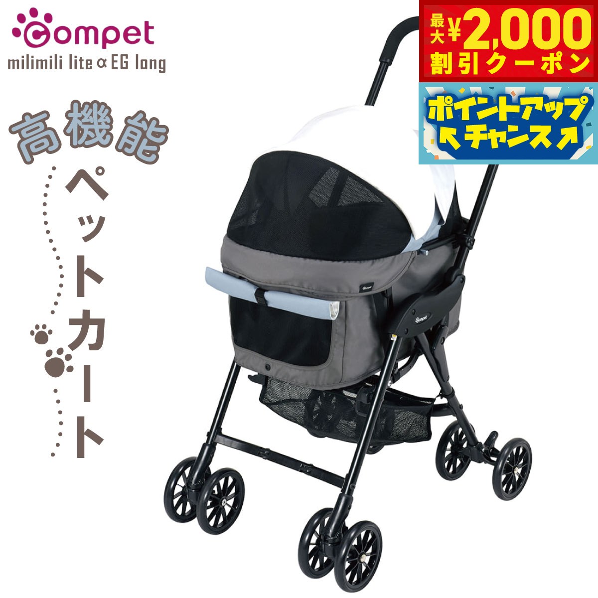 人気のミリミリライトアルファEGロングに、タイヤが着脱可能なタイプが登場。メンテナンスがしやすくなり、お気に入りのペットカートを、より長く・快適にご使用いただけます!商品名コムペット ペットカート ミリミリライト アルファ EGロングDブランドCOMPET耐荷重耐荷重:12kg(2匹まで、ペット専用)、荷物カゴ耐荷重:3kg大きさ使用時:W515×D750×H1007mm、折畳時:W390×D260×H1005mm、キャリー内寸(幌を除く):W270×D550×H250mm 【ここがポイント】●タイヤが着脱できるニューモデル登場!人気のミリミリ EG ロングに、タイヤが着脱可能なタイプが登場。メンテナンスがしやすくなり、お気に入りのペットカートを、より長く・快適にご使用いただけます!またタイヤが外せることで、梱包サイズを宅配便で配送できる“三辺合計160cm以下”に納めました。●メンテナンス性がアップ。タイヤの交換がご自宅で可能になります。●取り付けに工具は必要なく、タイヤに車体フレームを差し込むだけのワンタッチ。装着部分は、専用金具によりしっかりと固定されます。【大人気のロングモデル】発売以来、圧倒的な人気を誇るロングモデル。キャリーが550mmと従来のミリミリシリーズよりゆったり。ミニチュアダックスフントなどの体長の長いワンちゃんや、2匹でのご利用に最適なモデルです。【4ヵ所のエアスルーウィンドーで快適】ワンちゃんは 暑さが苦手です。前後4ヵ所になったエアスルーウィンドーは、風を通し、カート内の熱をにがすので快適にすごせます。【キャリー付きのままさっと折りたためる、4.4kgの軽量モデル】キャリーを車体につけたままコンパクトに折りたため、お出かけ先やカフェなどで場所を取りません。また軽量で持ち運びしやすいので、移動中の階段などにもさっと対応することができます。【エッグショック搭載!】愛犬を振動から守ります。赤ちゃんの安全性を追求し、1998年、コンビは卵も割れないほどの超・衝撃吸収素材 「エッグショック」を開発。「エッグショック」はベビーカーやチャイルドシート等に採用されています。この「エッグショック」をペットカートにも採用し、走行時の振動や衝撃を減らして、愛犬も快適なお出かけができます。【大型になった荷物カゴ】車体下部の荷物カゴはミリミリ EG ロングシリーズと同タイプの容量5.8リットル。従来のミリミリライトシリーズより1.4リットル多くの荷物が入れられるようになりました。【ファスナー式で開閉ラクラク】幌の開口部はファスナー式でスムーズに開閉でき、小さなペットの抜け出しが防止できます。【キャリーカバーは「丸洗い」可能】キャリーカバーは、簡単に取り外せて丸洗いOK。抜け毛やにおいが残りがちなキャリーをいつも清潔に保てます。※ご購入時は後輪が外れた状態でお届けします。車輪をお客様ご自身で取り付けていただく必要がございます。 ※本製品には専用リードが2本付属します。本体重量4.4kgメーカー名コンビ株式会社コムペット ペットカート ミリミリライト アルファ EGロングDペットカート初となる三つ折りフレームを採用。車のトランクにもらくらく収納できます。※一部の商品は折りたたみ方法が異なります。片手でもスムーズに押せる操作性。長年培ってきたベビーカーの技術とノウハウの結晶です。 アルミ製のしっかりしたフレーム。石畳でもぶれにくく、ペットのカラダへの負担を減らせます。 暑さが苦手なペットのために。前面には開閉自由のメッシュ窓付き。全モデル、キャリー部分はUVカット。 発売以来、圧倒的な人気を誇るロングモデル。キャリーが550mmと従来のミリミリシリーズよりゆったり。ミニチュアダックスフントなどの体長の長いワンちゃんや、2匹でのご利用に最適なモデルです。キャリーを車体につけたままコンパクトに折りたため、お出かけ先やカフェなどで場所を取りません。また軽量で持ち運びしやすいので、移動中の階段などにもさっと対応することができます。車体下部の荷物カゴはミリミリ EG ロングシリーズと同タイプの容量5.8リットル。従来のミリミリライトシリーズより1.4リットル多くの荷物が入れられるようになりました。ミリミリライト アルファ EG ロングでは3ヵ所だったエアスルーウィンドーがキャリー後部に1ヵ所増やし、計4ヵ所に!通気性がさらにアップしました。従来のライトシリーズでは1本付属だった専用リードが、本製品には2本付属します。キャリーカバーは、簡単に取り外せて丸洗いOK。抜け毛やにおいが残りがちなキャリーをいつも清潔に保てます。 人気のミリミリライトアルファEGロングに、タイヤが着脱可能なタイプが登場。メンテナンスがしやすくなり、お気に入りのペットカートを、より長く・快適にご使用いただけます!