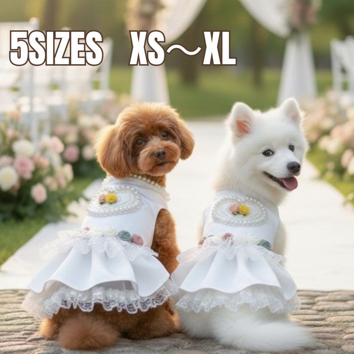 当ページは小型犬用です。 ★中型犬用はこちら 大切な日を、特別なドレスで。 結婚式でのリングドッグや、お誕生日、特別な記念撮影に。 幾重にも重なったチュールが愛犬を最高に可愛く演出する、 ロングセラーのウェディングドレス。 パールやリボン、お花やレースなど・・・特別なディテールが詰まった、とってもキュートなお洋服です。 愛犬のかわいらしさがぐっと引き立ちます。 ★サイズ表 【XS】胴周り26cm 首周り20cm 前背丈15cm 後着丈21cm 【S】胴周り32cm 首周り22cm 前背丈17cm 後着丈26cm 【M】胴周り36cm 首周り22cm 前背丈20cm 後着丈28cm 【L】胴周り40cm 首周り29cm 前背丈21cm 後着丈33cm 【XL】胴周り44cm 首周り32cm 前背丈23cm 後着丈38cm 【XXL】胴周り48cm 首周り36cm 前背丈25cm 後着丈40cm 上記は、服の実寸です。 ※前空きボタンタイプ。伸縮性はございませんので 特に毛の長いワンちゃんはワンサイズ大き目をお選びください。 【おススメ犬種】 超小型 チワワ ポメラニアン ミニピン(ピンシャー) ヨークシャーテリア(ヨーキー) 小型 パグ トイプードル ウェスティー ケアンテリア シーズー ジャックラッセルテリア シュナ(ミニチュアシュナウザー) 日本スピッツ ビションフリーゼ ミニチュアダックスフンド (ダックス) ボストンテリア ペキニーズなど ★タキシード・ウェディングドレス関連商品